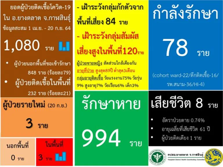 วันที่ 21 กันยายน 2564 ผู้สื่อข่าวรายงานว่า จากการติดตามสถานการณ์โรคติดเชื้อโควิด-19 ที่ จ.กาฬสินธุ์ โดยยังคงพบผู้ป่วยติดเชื้อรายวัน ล่าสุดที่ อ.ยางตลาด ซึ่งพบผู้ได้รับเชื้อสูงกว่าอำเภอต่างๆ ซึ่งวันนี้ข้อมูลสะสมตั้งแต่เดือนเมษายนถึงปัจจุบันรวม 1,080 ราย เป็นผู้ป่วยนอกพื้นที่ขอเข้ารับการรักษา 848 ราย ผู้ป่วยติดเชื้อในพื้นที่ 232 ราย กำลังรักษา 78 ราย รักษาหาย 994 ราย และเสียชีวิต 8 ราย ล่าสุด พบคลัสเตอร์ใหม่ในพื้นที่ ต.คลองขาม อ.ยางตลาด ผู้ป่วยติดเชื้อ 26 ราย เสี่ยงสูง 48 ราย ขณะที่สถานการณ์ภาพรวมของจังหวัดล่าสุดวันนี้พบผู้ป่วยเพิ่ม 12 ราย มียอดผู้ป่วยสะสม 7,484 ราย