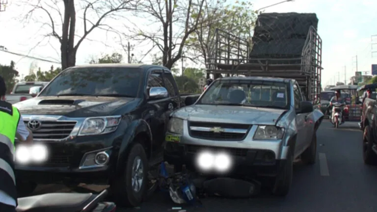เบื้องต้นจากการตรวจสอบในที่เกิดเหตุพบว่าบริเวณไหล่ทางถนนด้านซ้ายพบรถยนต์กระบะยี่ห้อฟอร์ดสีบรอนซ์เทาแคป ทะเบียน บต 9407 ปราจีนบุรี หลังรถบรรทุกสิ่งของมาเต็มกระบะ โดยมีนายธเนศ ยังจิตร เป็นผู้ขับขี่ได้รับบาดเจ็บที่บริเวณโหนกแก้มด้านซ้ายแตกมีเลือดไหลออกที่แผลและจมูก สภาพรถด้านหน้าพังยับเยิน ห่างออกไป 100 เมตร ทางด้านขวาพบรถยนต์กระบะยี่ห้อ Toyota Hilux Vigo Cab สีดำ ทะเบียน บฉ 6717 นครนายก โดยมีนายแสนตรี ภักดีราช อายุ 55 ปี เป็นคนขับ อยู่เลนขวาสุดติดกับเกาะกลางถนนโดยบริเวณด้านซ้ายของรถถูกชนมีรอยถลอกและบุบ ติดกันพบรถยนต์กระบะ ยี่ห้อ เชฟสีบรอนซ์ตอนเดียวมีคอก ทะเบียน ยค 4199 ชลบุรี จอดเบียดอยู่โดยด้านหลังรถถูกชนมีรอยถลอก บริเวณใต้ท้องรถด้านหน้าพบมีรถจักรยานยนต์ยี่ห้อ Honda Wave สีน้ำเงิน ทะเบียน กวว 314 ศรีสะเกษ ล้มอยู่ใสภาพพังยับเยินทั้งคัน ด้านหลังพบรถยนต์กระบะยี่ห้อ Toyota Revo ตอนเดียว สีขาว บรรทุกตระกล้าผลไม้ ทะเบียน บบ 8810 พิจิตร ถูกชนท้ายได้รับความเสียหายเพียงเล็กน้อย ท้ายรถพบรถยนต์เก๋งยี่ห้อVIOS สีขาว ทะเบียน กบ 7547 เชียงราย โดยด้านหน้ารถบริเวณฝากระโปรงรถยุบ กันชนฉีก โดยมีนางสุวดี อุตโน อายุ 62 ปี เป็นคนขับ อยู่ในอาการตกใจ