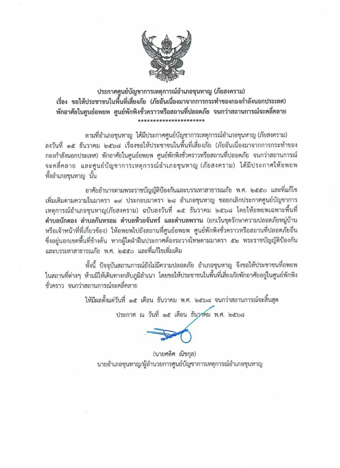 เมื่อวันที่ 15 ธันวาคม 2568 นายศดิศ ณิชกุล นายอำเภอขุนหาญ/ผู้อำนวยการศูนย์บัญชาการเหตุการณ์อำเภอขุนหาญ ลงนามใน ประกาศศูนย์บัญชาการเหตุการณ์อำเภอขุนหาญ (ภัยสงคราม) เรื่อง ขอให้ประชาชนในพื้นที่เสี่ยงภัย (ภัยอันเนื่องมาจากการกระทำของกองกำลังนอกประเทศ) พักอาศัยในศูนย์อพยพ ศูนย์พักพิงชั่วคราวหรือสถานที่ปลอดภัย จนกว่าสถานการณ์จะคลี่คลาย