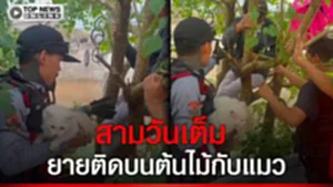 สามวันเต็ม ยายลอยคอติดน้ำท่วมอยู่กับแมวบนต้นไม้ ขอกู้ภัยให้ช่วยแมวด้วย