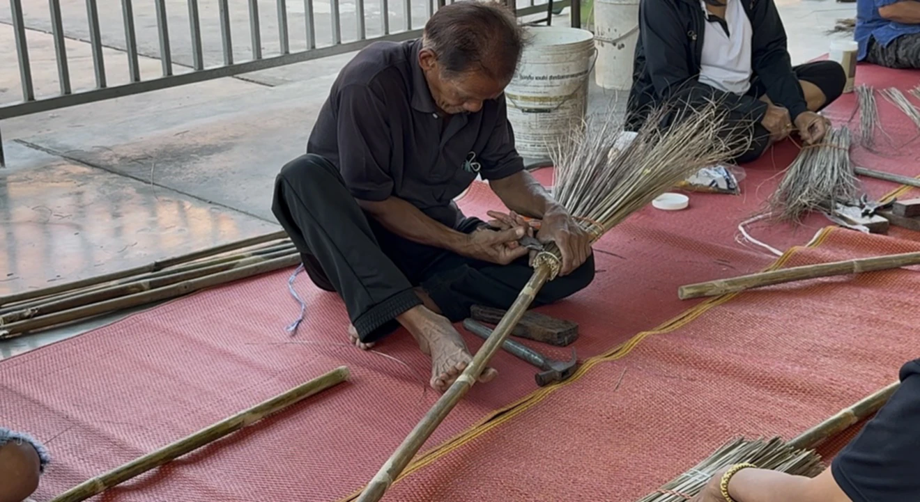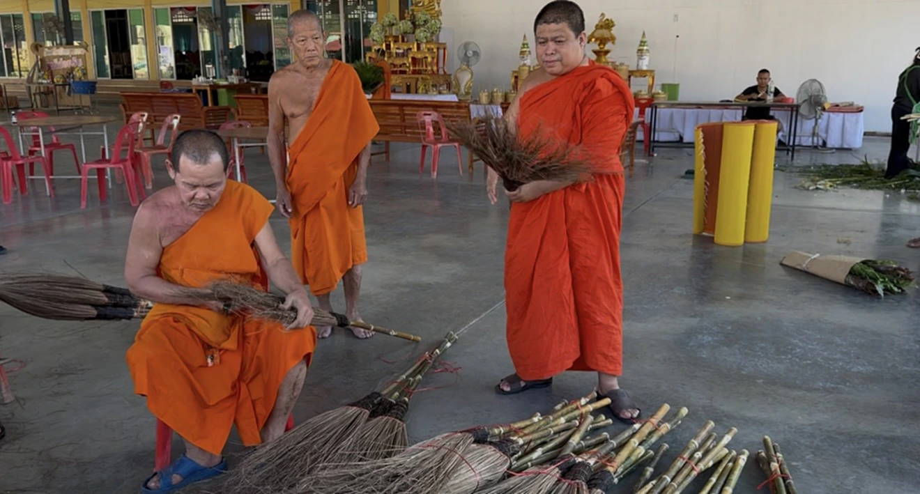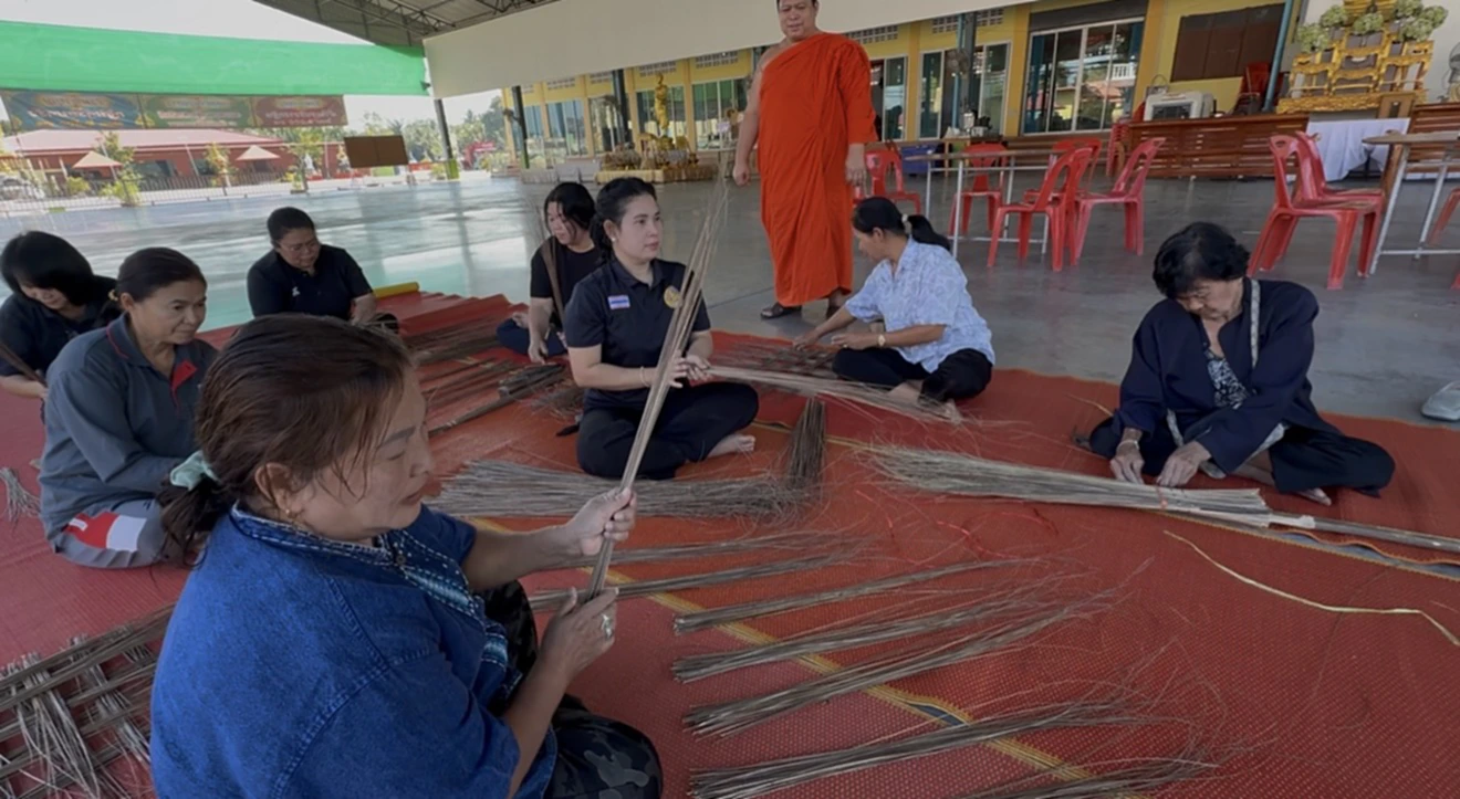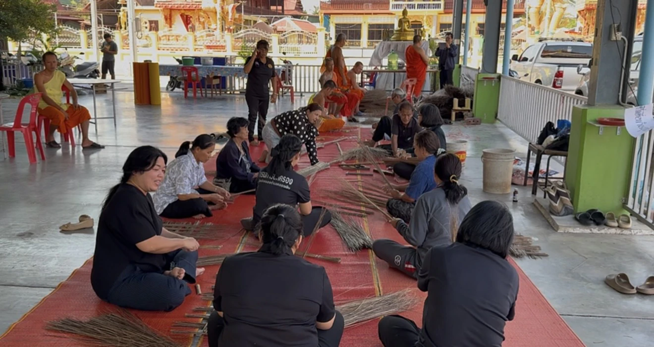 เจ้าอาวาสนำคณะสงฆ์และชาวบ้านช่วยกันทำไม้กวาดทางมะพร้าวส่งมอบไปฟื้นฟูที่จังหวัดสงขลา