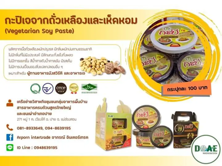 จังหวัดแม่ฮ่องสอน ไม่เพียงเป็นดินแดนแห่งความหลากหลายทางวัฒนธรรมและทรัพยากรธรรมชาติที่อุดมสมบูรณ์ แต่ยังเป็นแหล่งปลูกถั่วเหลืองคุณภาพกว่า 60,000 ไร่ และเป็นพืชเศรษฐกิจหลักที่ถูกนำมาแปรรูปอย่างสร้างสรรค์ ด้วยนวัตกรรมที่ผสมผสานภูมิปัญญาชาวบ้านและเทคโนโลยีสมัยใหม่ เป็นผลิตภัณฑ์ “กะปิเจ” (Vegetarian Soy Paste) สร้างมูลค่าเพิ่มให้กับผลิตภัณฑ์ชุมชน