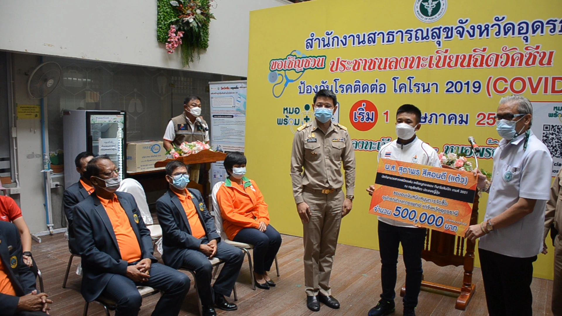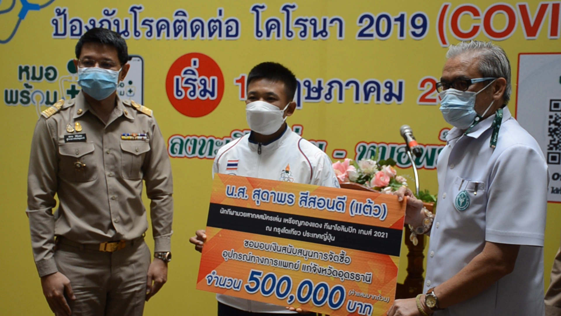 นายสยาม ศิริมงคล ผจว.อุดรธานี กล่าวว่า “น้องแต้ว” นักมวยหญิงสากลเหรียญทองแดงโอลิมปิกทีมชาติไทย ได้นำเงินส่วนตัวมามอบสนับสนุน การจัดซื้ออุปกรณ์ทางการแพทย์ เพื่อช่วยโรงพยาบาลต่าง ๆ ซึ่งเงินที่น้องแต้วมอบให้ ก็จะได้มอบให้ทางสาธารณสุขที่รับผิดชอบดูแลทั้ง 20 อำเภอ นำเอาไปใช้ประโยชน์ทางการแพทย์ ซึ่งก็ได้เอาไปสมทบกับกองทุนของสาธารณสุขที่ตั้งไว้อยู่ด้วย เพื่อที่จะนำไปมอบหรือว่าซื้ออุปกรณ์ทางการแพทย์ ให้กับโรงพยาบาลขนาดย่อย ที่ยังขาดแคลนอุปกรณ์เครื่องมือทางการแพทย์ โดยอุดรธานีตอนนี้มีผู้ติดเชื้อมากกว่าหมื่นราย ต้องขออภัยที่ไม่ได้จัดขบวนแห่ให้กับน้องแต้ว เพราะในช่วงสถานการณ์โควิด แต่ถ้าหากว่าเป็นสถานการณ์ปกติ คงได้ขึ้นรถแห่ไปทั่วเมืองแล้ว
