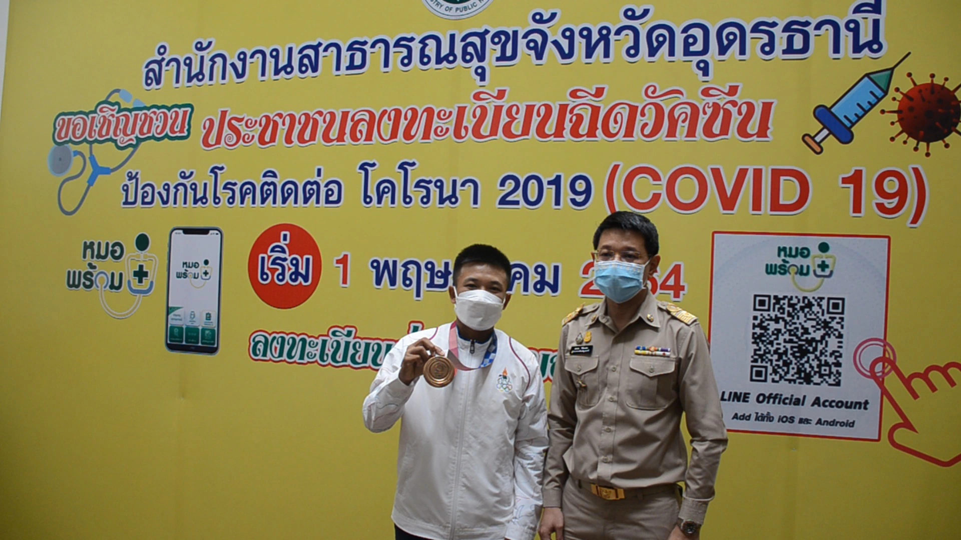วันที่ 27 กันยายน 2564 เวลา 11.00 น. ที่บริเวณโถงชั้น 1 สำนักงานสาธารณสุข จ.อุดรธานี นายสยาม ศิริมงคล ผู้ว่าราชการ จ.อุดรธานี นายจำรัส กังน้อย รอง ผวจ.อุดรธานี นพ.ปรเมษฐ์ กิ่งโก้ สสจ.อุดรธานี ผศ.จรูญ ถาวรจักร อธิการบดี มหาวิทยาลัยราชภัฎอุดรธานี ตัวแทนสมาคมกีฬา จ.อุดรธานี และภาคเอกชนอุดรธานี ให้การต้อนรับ เรือตรีหญิงสุดาพร สีสอนดี น้องแต้ว ฮีโร่เหรียญทองแดง มวยสากลสมัครเล่น โตเกียวเกมส์ 2021 ลูกหลานชาวอุดรธานี ในโอกาสเดินทางบ้านมาบ้านเกิด