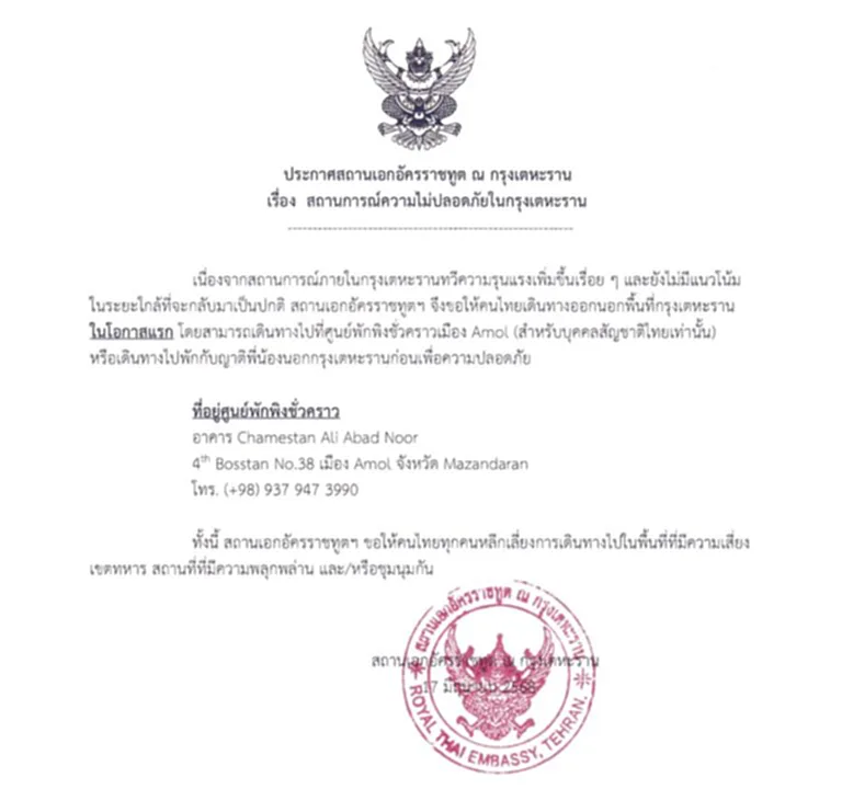 สถานทูตเอกอัครราชทูตจึงขอให้คนไทยเดินทางออกนอกพื้นที่กรุงเตหะรานโดยทันทีที่มีโอกาส โดยสามารถเดินทางไปที่ศูนย์พักพิงชั่วคราวเมืองอามอล (Amol) (สำหรับบุคคลสัญชาติไทยเท่านั้น) หรือเดินทางไปพัดกับญาติพี่น้องนอกกรุงเตหะรานก่อนเพื่อความปลอดภัย