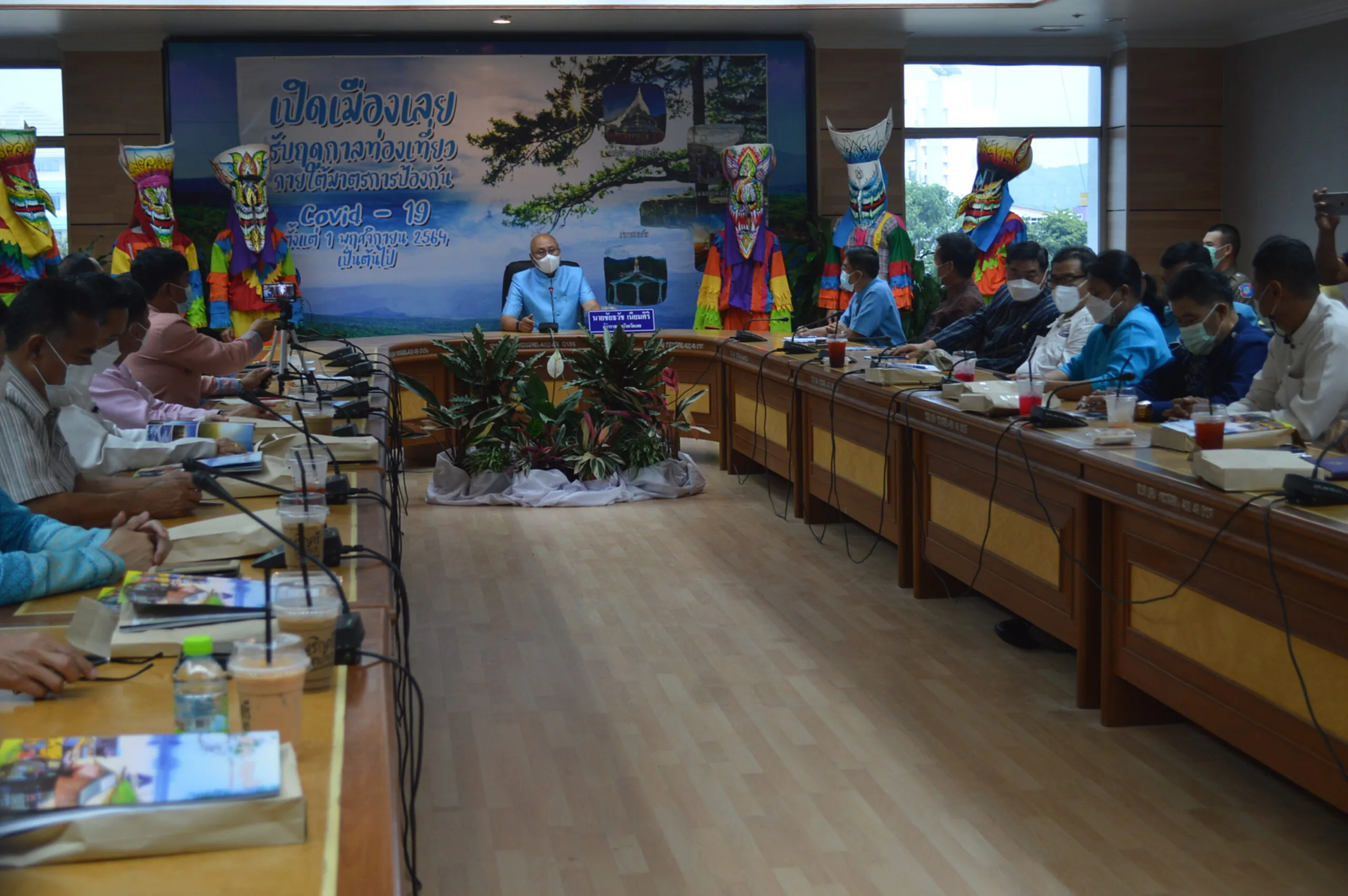 เมื่อเวลา 14.00 น. วันที่ 8 ตุลาคม 2564 ณ ห้องประชุมภูหลวง ชั้น 3 ศาลากลางจังหวัดเลย นายชัยธวัช เนียมศิริ ผู้ว่าราชการจังหวัดเลย ,นายโสภณ สุวรรณรัตน์, นายผดุงศักดิ์ หาญปรีชาสวัสดิ์ นายณรงค์ จีนอ่ำ รองผู้ว่าราชการจังหวัดเลย พร้อมด้วยนายอำเภอทั้ง 14 อำเภอ ร่วมแถลงข่าวแก่สื่อมวลชน เพื่อประชาสัมพันธ์ ”เปิดเมืองเลยรับฤดูกาลท่องเที่ยว ภายใต้มาตรการป้องกัน โควิด-19” เพื่อเป็นการประชาสัมพันธ์สร้างการรับรู้ให้กับนักท่องเที่ยวและประชาชนทั่วไป และเป็นการกระตุ้นเศรษฐกิจ ด้านการท่องเที่ยวของจังหวัดเลย จากสถานการณ์แพร่ระบาดของเชื้อไวรัสโคโรนา 2019