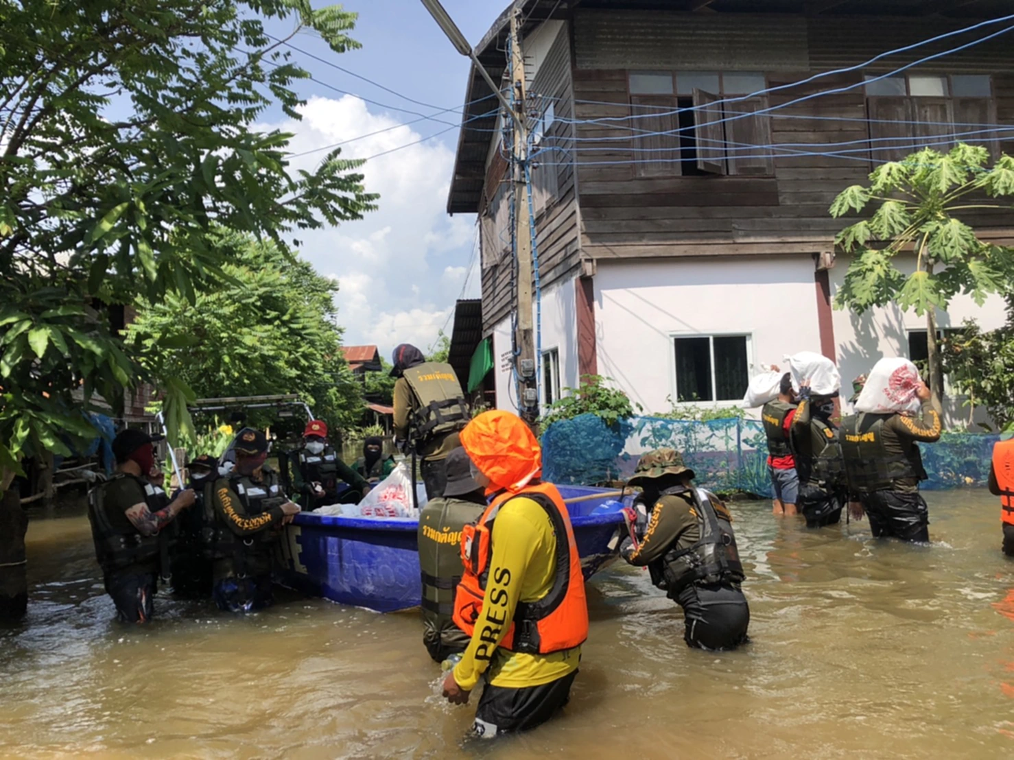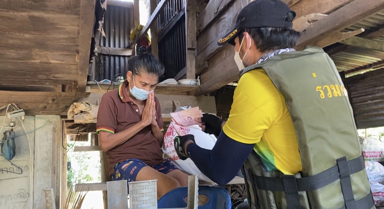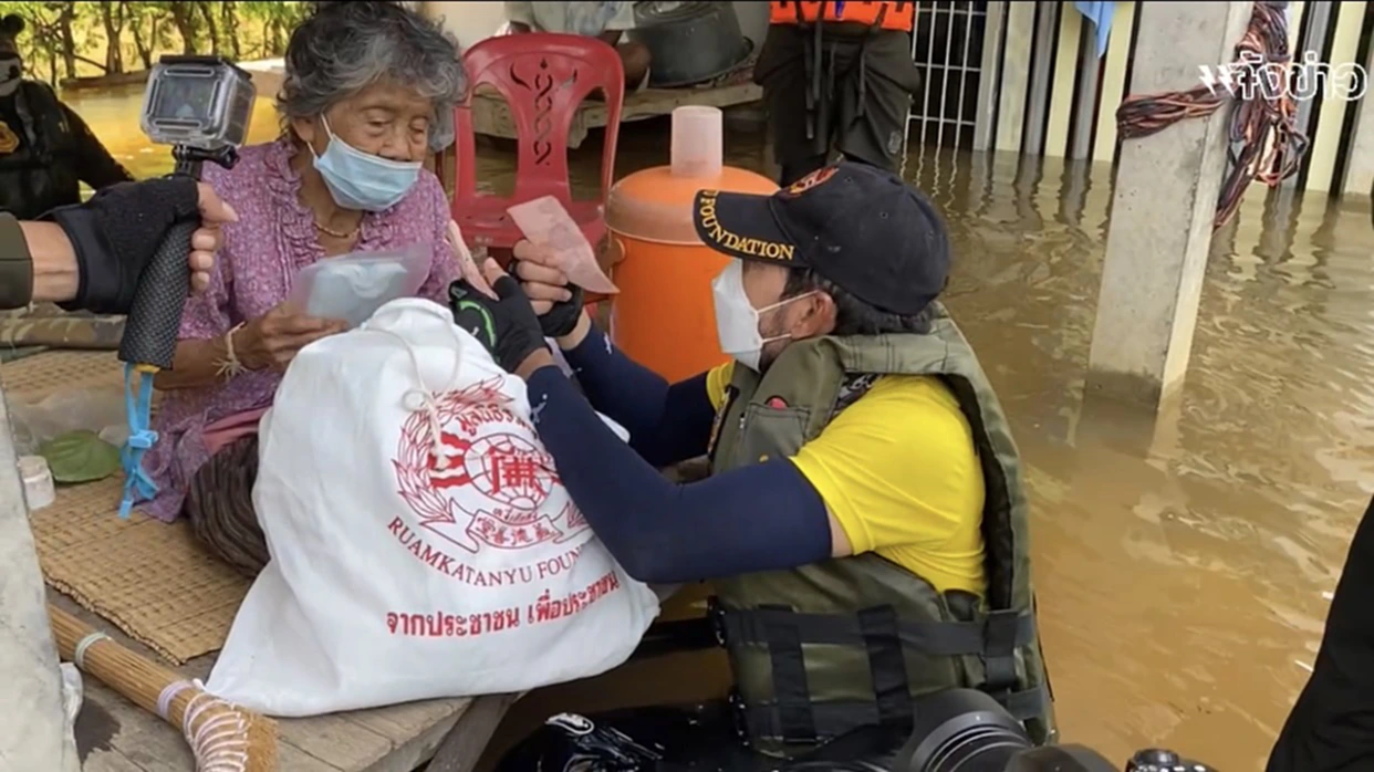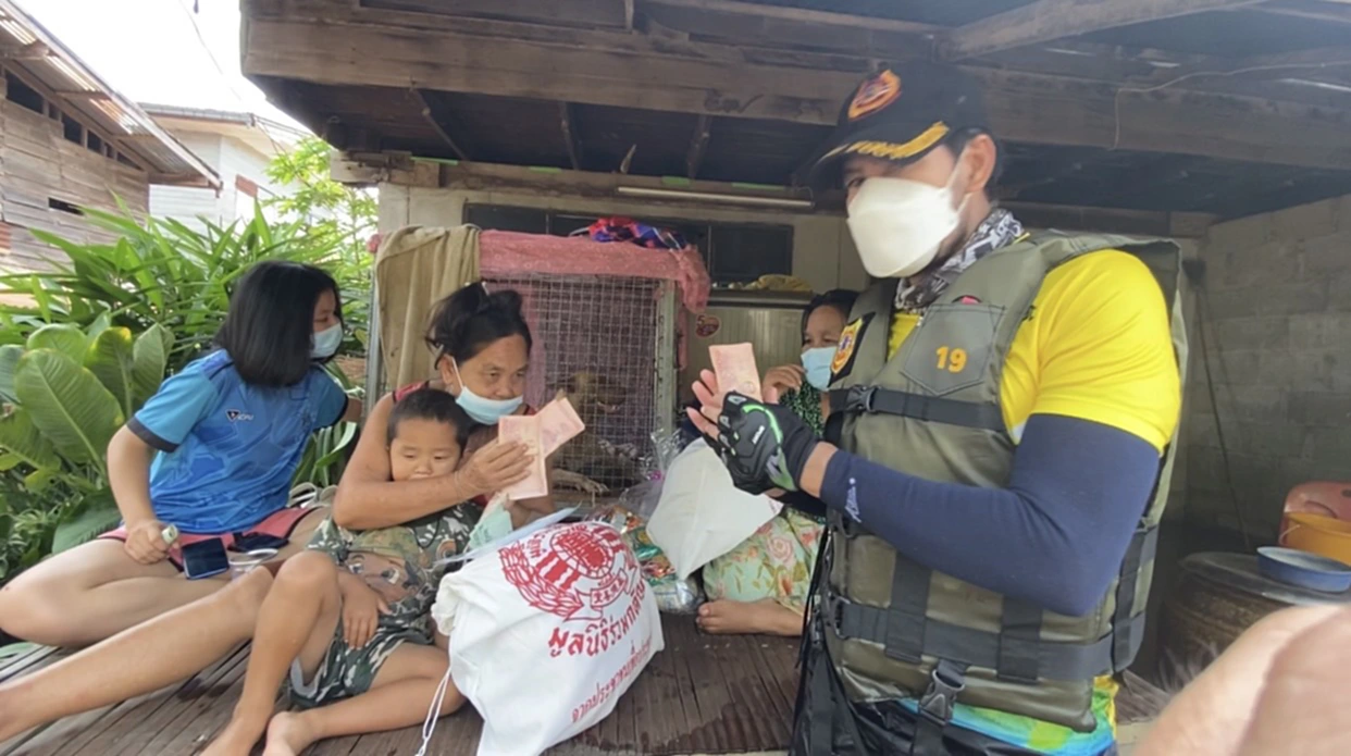 โดย บิณฑ์ บรรลือฤทธิ์ เปิดเผยว่านอกจากการมอบถุงยังชีพแล้วยังมอบเงินให้หลังละ 700-1000 บาท แล้วแต่ความเดือดร้อนหนักเบา เพื่อเป็นการช่วยเหลือเบื้องต้นให้กับผู้ประสบภัย หลังจากนั้นคาดว่าจะต้องเดินทางกลับสำนักงานใหญ่เพื่อจัดเตรียมถุงยังชีพเพิ่มเติมจากนั้นจะดูว่ายังมีชุมชนไหนที่น้ำยังท่วมสูง มูลนิธิร่วมกตัญญูจะเร่งเข้าไปให้การช่วยเหลือทันที