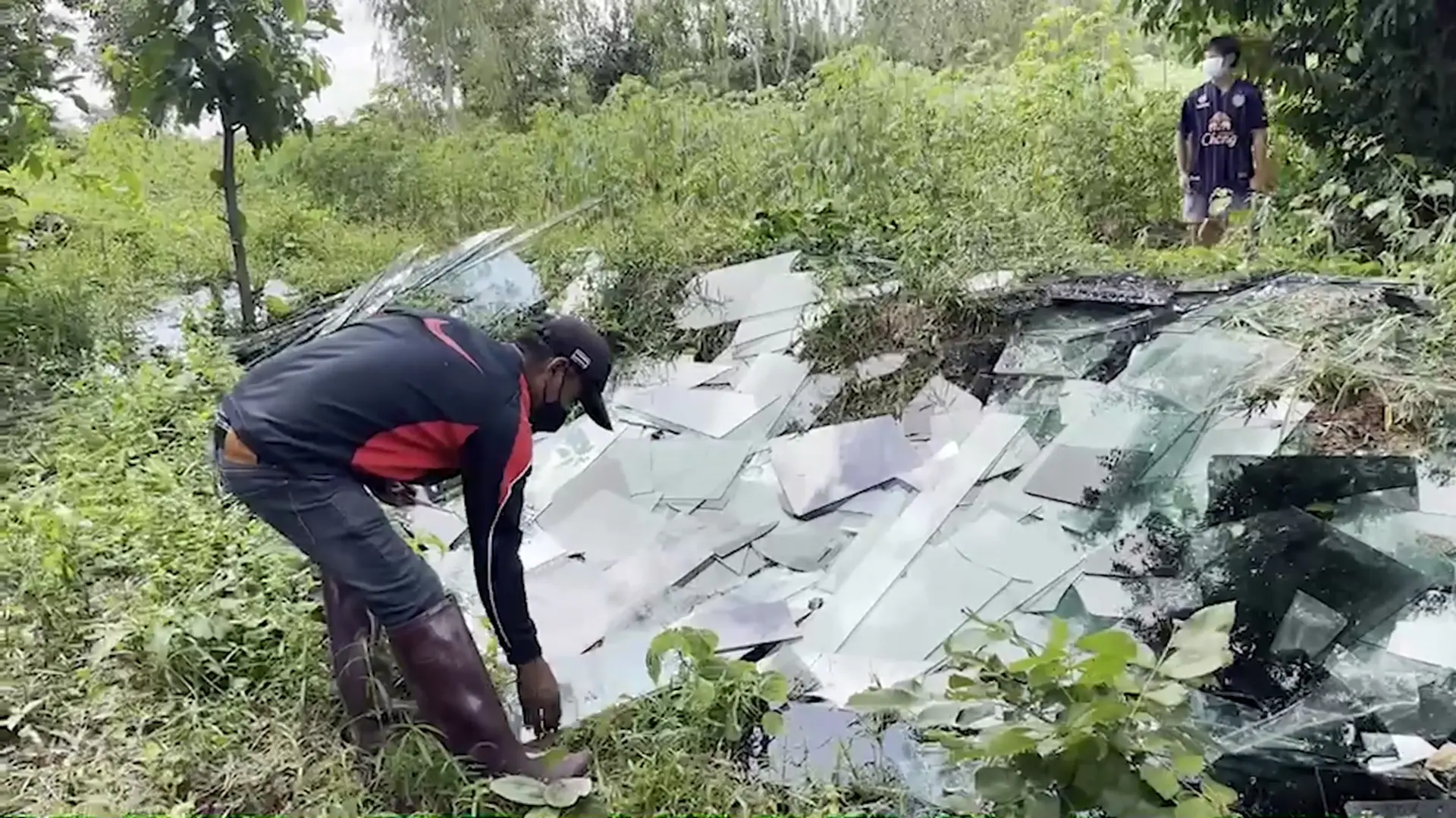 จากการตรวจสอบ บริเวณทางไปทุ่งนาของชาวบ้าน เขตหมู่บ้านโกรกหญ้าคา หมู่ 2 และหมู่ 7 ต.สะเดา อ.นางรอง พบเศษกระจกหลายชนิด มากกว่า 3,000 กก. ทั้งกระจกสีชา สีใส และกระจกลายดอก มีความหนา 3 – 6 มิลเมตร ซึ่งคาดว่าจะเป็นของผู้รับเหมาติดตั้งกระจก เอามาทิ้งเกลื่อนทั้งบริเวณถนน