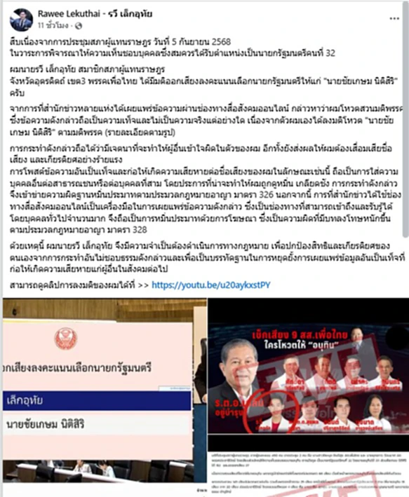 นายรวี เล็กอุทัย สส.อุตรดิตถ์ เขต3 พรรคเพื่อไทย โพสต์ข้อความผ่านเฟสบุ๊กชี้แจงว่า จากการที่สำนักข่าวหลายแห่งได้เผยแพร่ข้อความผ่านช่องทางสื่อสังคมออนไลน์ กล่าวหาว่าผมโหวตสวนมติพรรค ซึ่งข้อความดังกล่าวถือเป็นความเท็จและไม่เป็นความจริงแต่อย่างใด เนื่องจากตัวผมเองได้ลงมติโหวต “นายชัยเกษม นิติสิริ” ตามมติพรรค การกระทำดังกล่าวถือได้ว่ามีเจตนาที่จะทำให้ผู้อื่นเข้าใจผิดในตัวของผม อีกทั้งยังส่งผลให้ผมต้องเสื่อมเสียชื่อเสียง และเกียรติยศอย่างร้ายแรง