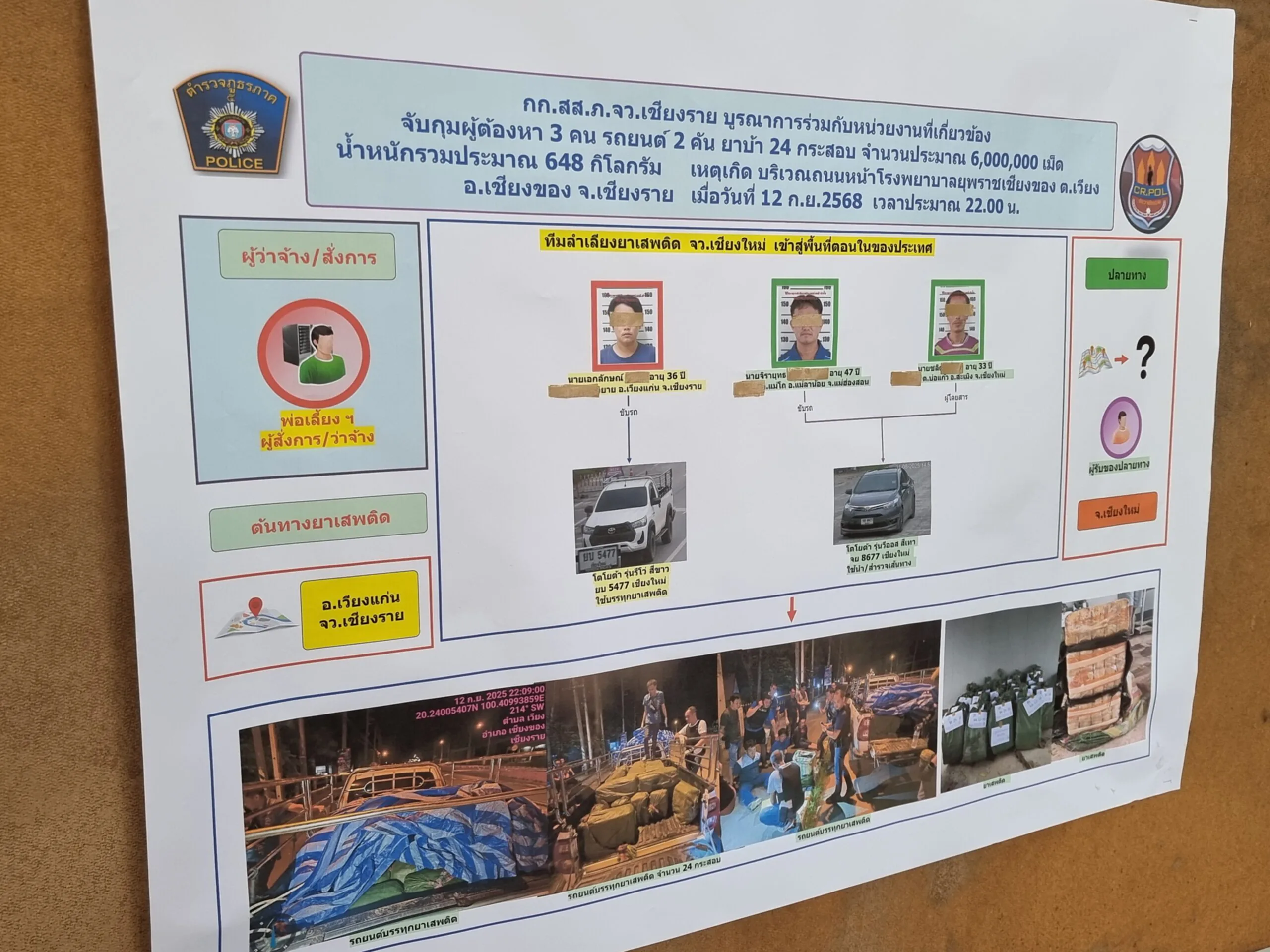 โดยคดีที่ 1 ที่ จ.เชียงราย เมื่อวันที่ 12 ก.ย.68 เวลาประมาณ 22.00 น. หน่วย ชปส.ภ.จว.เชียงราย, สภ.เชียงของ จว.เชียงราย, ชป.ขยายผล ศอ.ปส.ภ.5 บุกรวบตัวขบวนการค้ายาเสพติด บริเวณถนนหน้าโรงพยาบาลยุพราชเชียงของ ต.เวียง อ.เชียงของ จว.เชียงราย ได้ผู้ต้องหา 3 คน คือ นายเอกลักษณ์ อายุ 36 ปี อ.เวียงแก่น จ.เชียงราย 2.นายนายชลิต อายุ 33 ปี อ.สะเมิง จ.เชียงใหม่ 3.นายนายจิรายุทธ อายุ 47 ปี อ.แม่ลาน้อย จ.แม่ฮ่องสอน