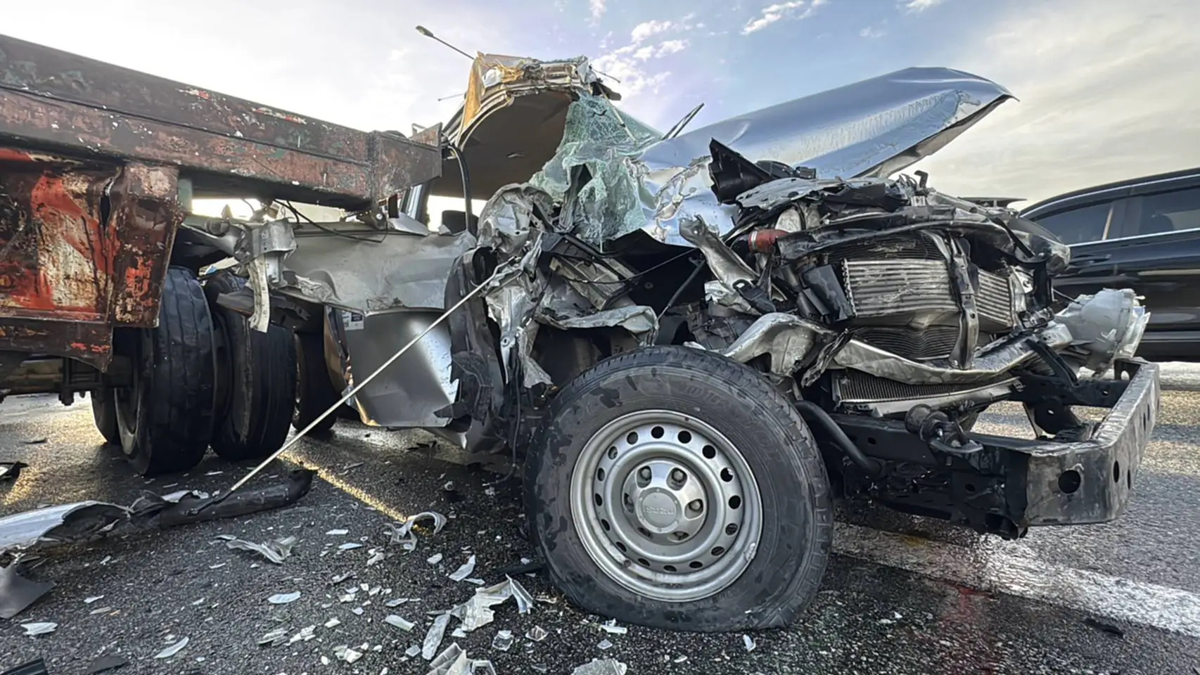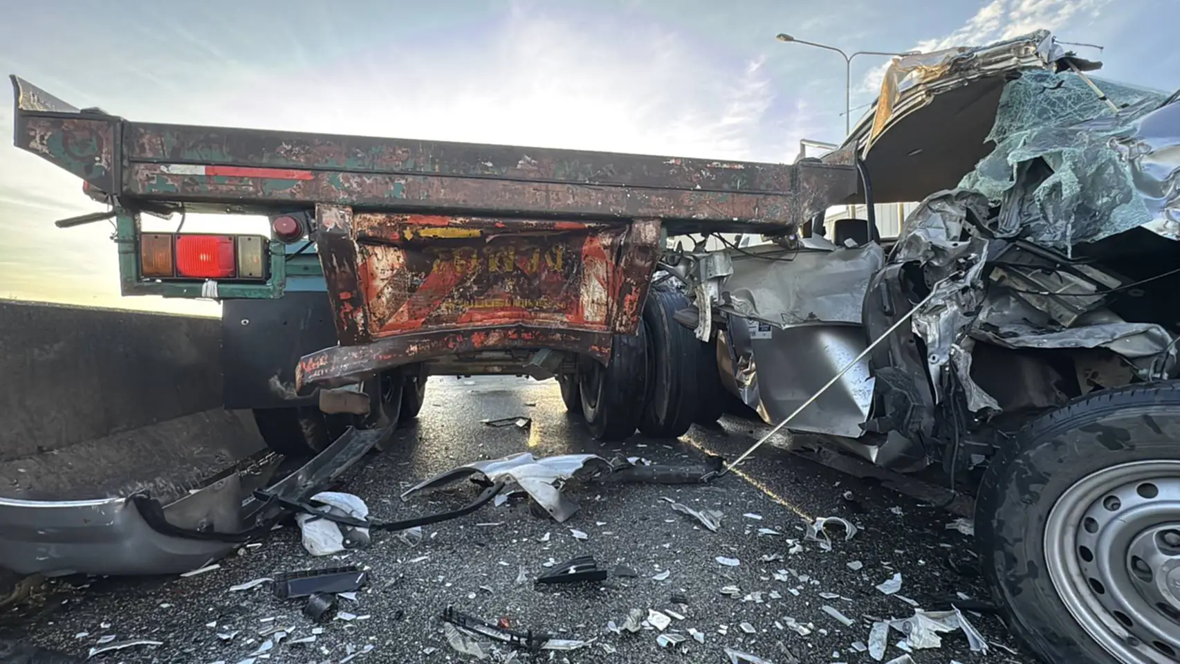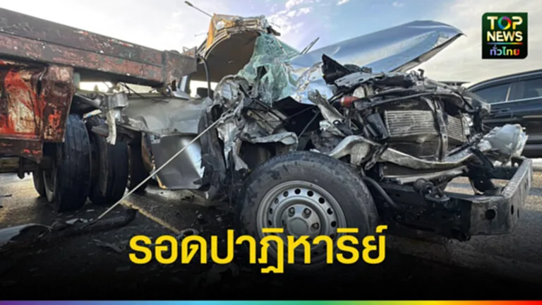 กระบะวิ่งไหล่ทางซ้ายพุ่งชนท้ายพ่วงจอดเสียบนทางด่วนกาญจนาฯ รถพังยับทั้งคัน แต่คนในรถรอดปาฏิหาริย์ ไร้รอยขีดข่วน เจ้าหน้าที่เตือนอย่าวิ่งทางฉุกเฉิน