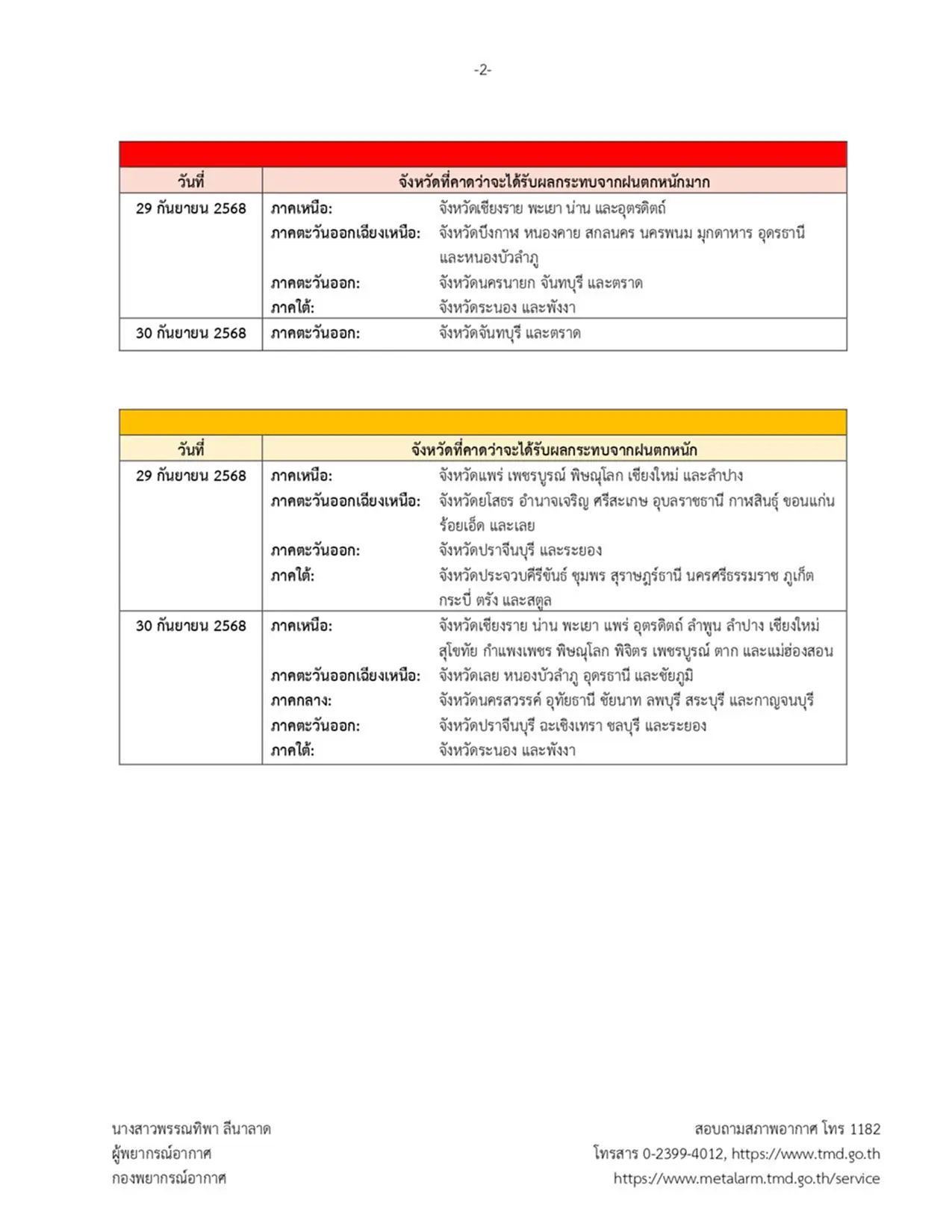 พยากรณ์อากาศ 24 ชั่วโมงข้างหน้า ประเทศไทยมีฝนตกหนักหลายพื้นที่ และมีฝนตกหนักถึงหนักมากบางแห่งบริเวณภาคตะวันออกเฉียงเหนือ และภาคตะวันออก โดยเฉพาะบริเวณจังหวัดบึงกาฬ สกลนคร นครพนม อุดรธานี ขอนแก่น กาฬสินธุ์ มุกดาหาร จันทบุรี และตราด ขอให้ประชาชนบริเวณประเทศไทยตอนบนระวังอันตรายจากฝนตกหนักถึงหนักมากและฝนที่ตกสะสม ซึ่งอาจทำให้เกิดน้ำท่วมฉับพลัน น้ำป่าไหลหลาก และน้ำล้นตลิ่ง โดยเฉพาะพื้นที่ลาดเชิงเขาใกล้ทางน้ำไหลผ่าน พื้นที่ลุ่ม และพื้นที่น้ำท่วมขัง เนื่องจากร่องมรสุมกำลังแรงพาดผ่านภาคเหนือตอนล่าง ภาคกลางตอนบน และภาคตะวันออกเฉียงเหนือ ประกอบกับมรสุมตะวันตกเฉียงใต้กำลังค่อนข้างแรงพัดปกคลุมทะเลอันดามัน ภาคใต้ และอ่าวไทย