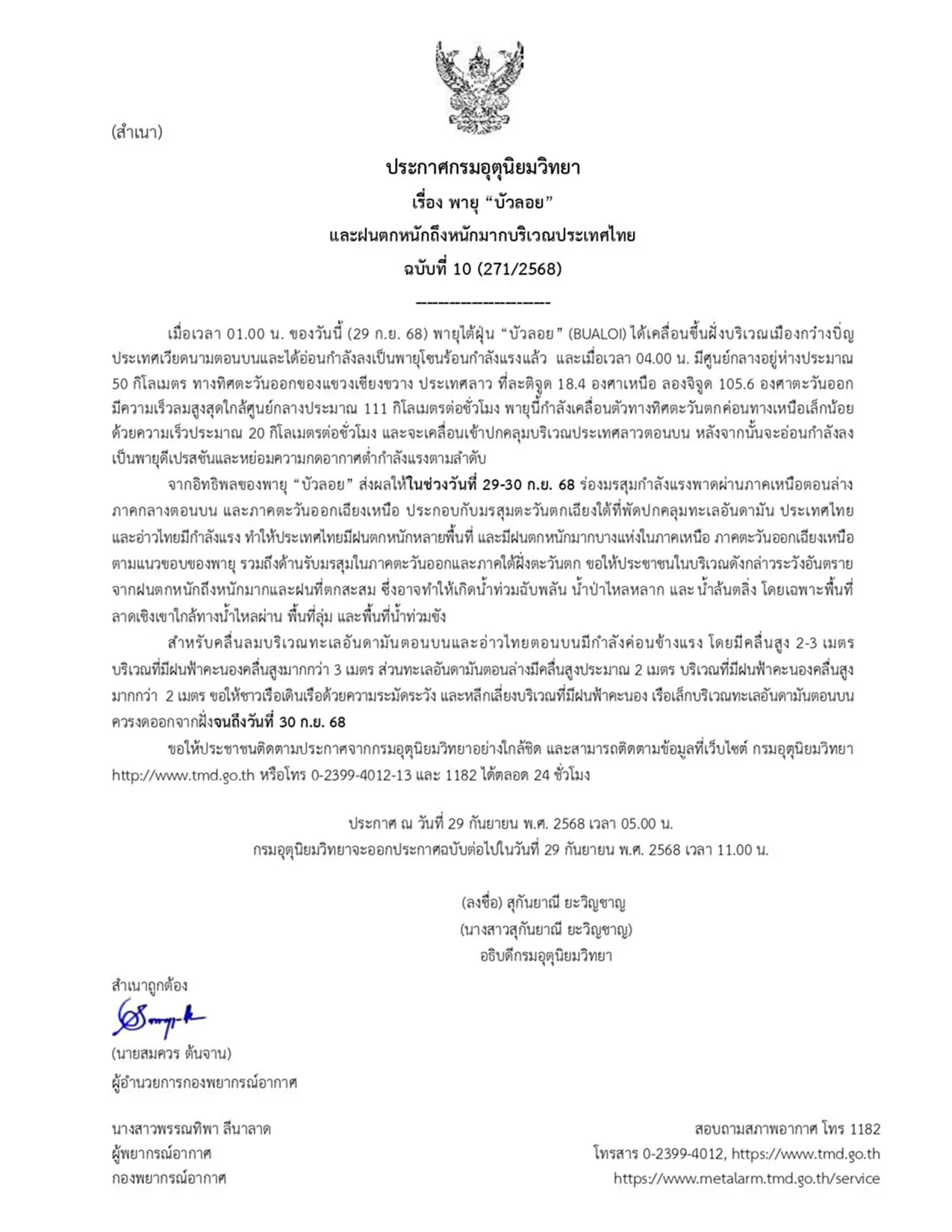 อนึ่ง พายุไต้ฝุ่น “บัวลอย” (BUALOI) ได้เคลื่อนขึ้นฝั่งบริเวณเมืองกว๋างบิ่ญ ประเทศเวียดนามตอนบนและได้อ่อนกำลังลงเป็นพายุโซนร้อนกำลังแรงแล้ว และจะเคลื่อนเข้าปกคลุมบริเวณประเทศลาวตอนบน หลังจากนั้นจะอ่อนกำลังลงเป็นพายุดีเปรสชันและหย่อมความกดอากาศต่ำกำลังแรงตามลำดับ