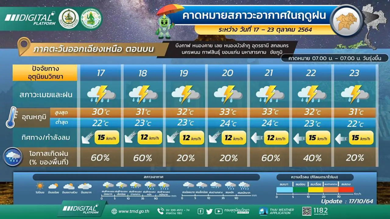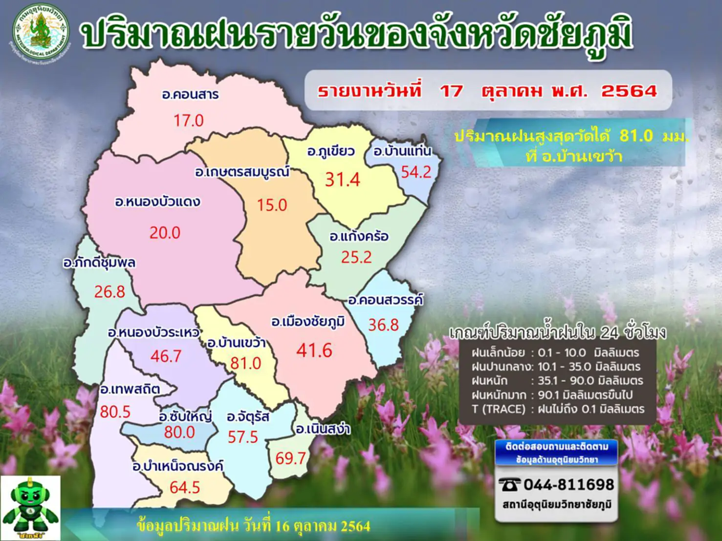 วันที่ 17 ตุลาคม 2564 ผู้สื่อข่าวรายงานความคืบหน้าหลังมีพายุฝนตกลงมาในระลอกที่ 2 หลังจากเมื่อวันที่ 24 กันยายน ที่ผ่านมาได้เกิดมีสถานการณ์น้ำท่วมใหญ่มาแล้ว ซึ่งล่าสุด อุดมวิทยาจังหวัดชัยภูมิได้ รายงานว่า จะมีน้ำฝนตกลงมาอย่างต่อเนื่องตั้งแต่วันที่ 16-23 ต.ค. โดยในพื้นที่อ.บ้านเขว้า ที่ผ่านมาได้มีปริมาณน้ำฝนตกลงมามากที่สุดทำให้ ระดับน้ำในลำน้ำชีเพิ่มขึ้นสูงอย่างต่อเนื่อง20-30เซนติเมตรโดยที่ตำบลลุ่มลำชี อำเภอบ้านเขว้า จังหวัดชัยภูมิ เริ่มมีรายงานความเสียหายจากมวลน้ำที่ไหลลงมาตามลำน้ำชี สร้างผลกระทบเบื้องต้น ในเขตตำบลลุ่มลำชี อำเภอบ้านเขว้า จังหวัดชัยภูมิ จากที่ก่อนหน้านี้ในช่วงปลายเดือนที่ผ่านมา มวลน้ำมหาศาลได้เข้าท่วมบ้านเรือนประชาชน พร้อมพื้นที่การเกษตรในเขตพื้นที่ตำบลลุ่มลำชีมาแล้ว 1 ครั้ง ชาวบ้านต้องใช้เวลาแช่อยู่ในน้ำนานเกือบครึ่งเดือน หลังจากที่น้ำแห้งไปได้เพียงไม่ถึง 1 สัปดาห์ ล่าสุดวันนี้ ระดับน้ำในแม่น้ำชี ไหลทะลัก ออกนอกเส้นทางบริเวณคันดินกั้นแม่น้ำชีที่ขาดออกเกือบถึง 10 จุด ใช้เวลาเพียง 1 วันระดับน้ำขึ้นล้นท่วมทุ่งนา และเส้นทางสัญจร โดยพบว่าเช้าวันนี้ระดับน้ำสูงถึง 20 – 25 เซนติเมตร
