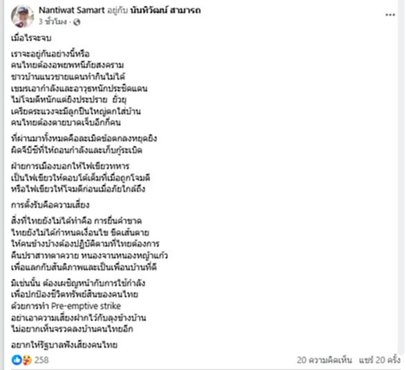เมื่อเวลา 08.00 น.วันที่ 1 ตุลาคม 2568 นายนันทิวัฒน์ สามารถ อดีตรองผู้อำนวยการสำนักข่าวกรองแห่งชาติ โพสต์เฟซบุ๊กว่า เมื่อไรจะจบ เราจะอยู่กันอย่างนี้หรือ คนไทยต้องอพยพหนีภัยสงคราม ชาวบ้านแนวชายแดนทำกินไม่ได้ เขมรเอากำลังและอาวุธหนักประชิดแดน ไม่โจมตีหนักแต่ยิงประปราย ยั่วยุ เครียดระแวงจะมีลูกปืนใหญ่ตกใส่บ้าน คนไทยต้องตายบาดเจ็บอีกกี่คน ที่ผ่านมาทั้งหมดคือละเมิดข้อตกลงหยุดยิง ผิดจีบีซีที่ให้ถอนกำลังและเก็บกู้ระเบิด ฝ่ายการเมืองบอกให้ไฟเขียวทหาร เป็นไฟเขียวให้ตอบโต้เต็มที่เมื่อถูกโจมตี หรือไฟเขียวให้โจมตีก่อนเมื่อภัยใกล้ถึง