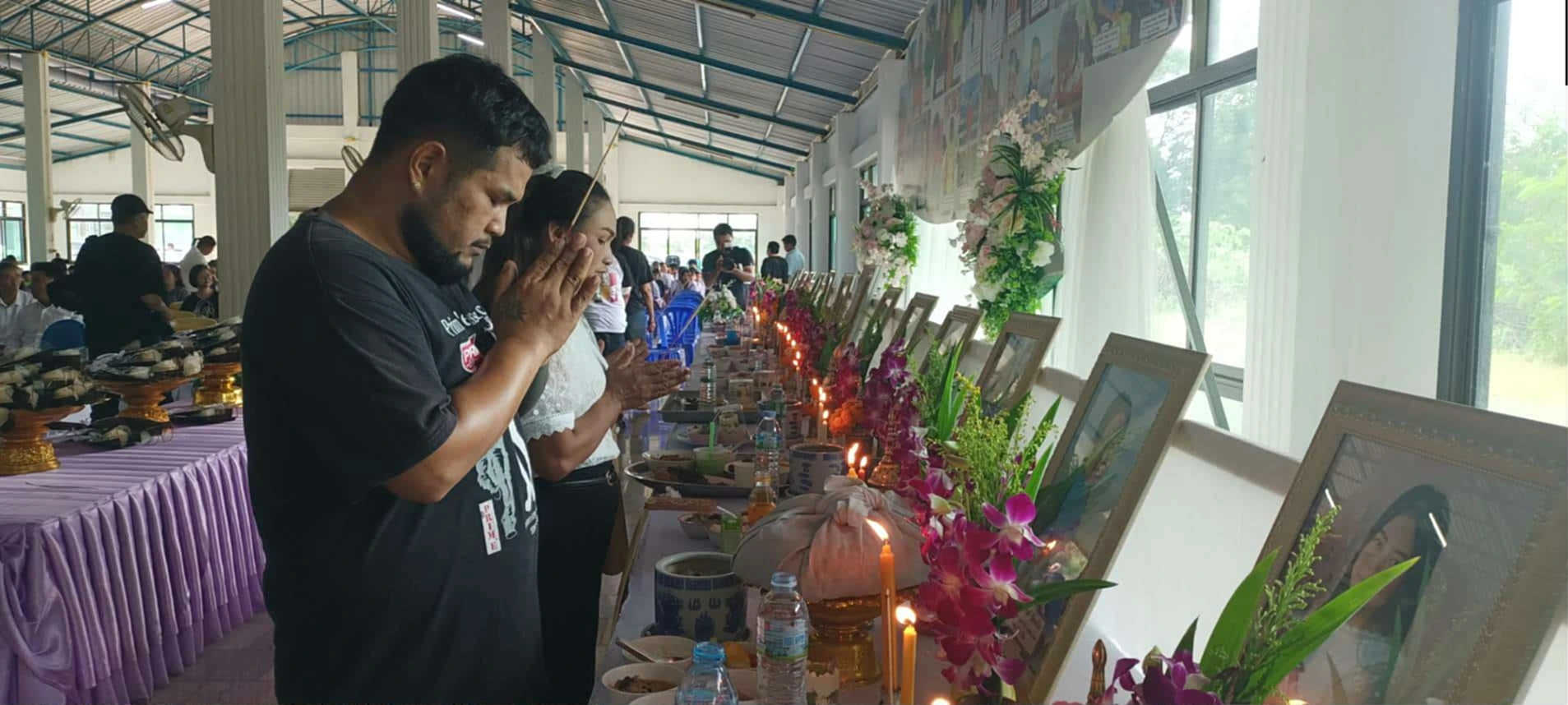 บรรยากาศพิธีวางดอกไม้รำลึก 23 ครูและนักเรียนเหยื่อรถบัสมรณะ ครอบครัวร่วมกับเพื่อนครูนักเรียน ส่วนราชการร่วมกันทำบุญอุทิศส่วนกุศล ครบรอบ 1 ปี ของการจากไป ผู้ปกครองเปิดเผยทั้งน้ำตายังทำใจไม่ได้และขอสู้คดีให้ถึงที่สุด