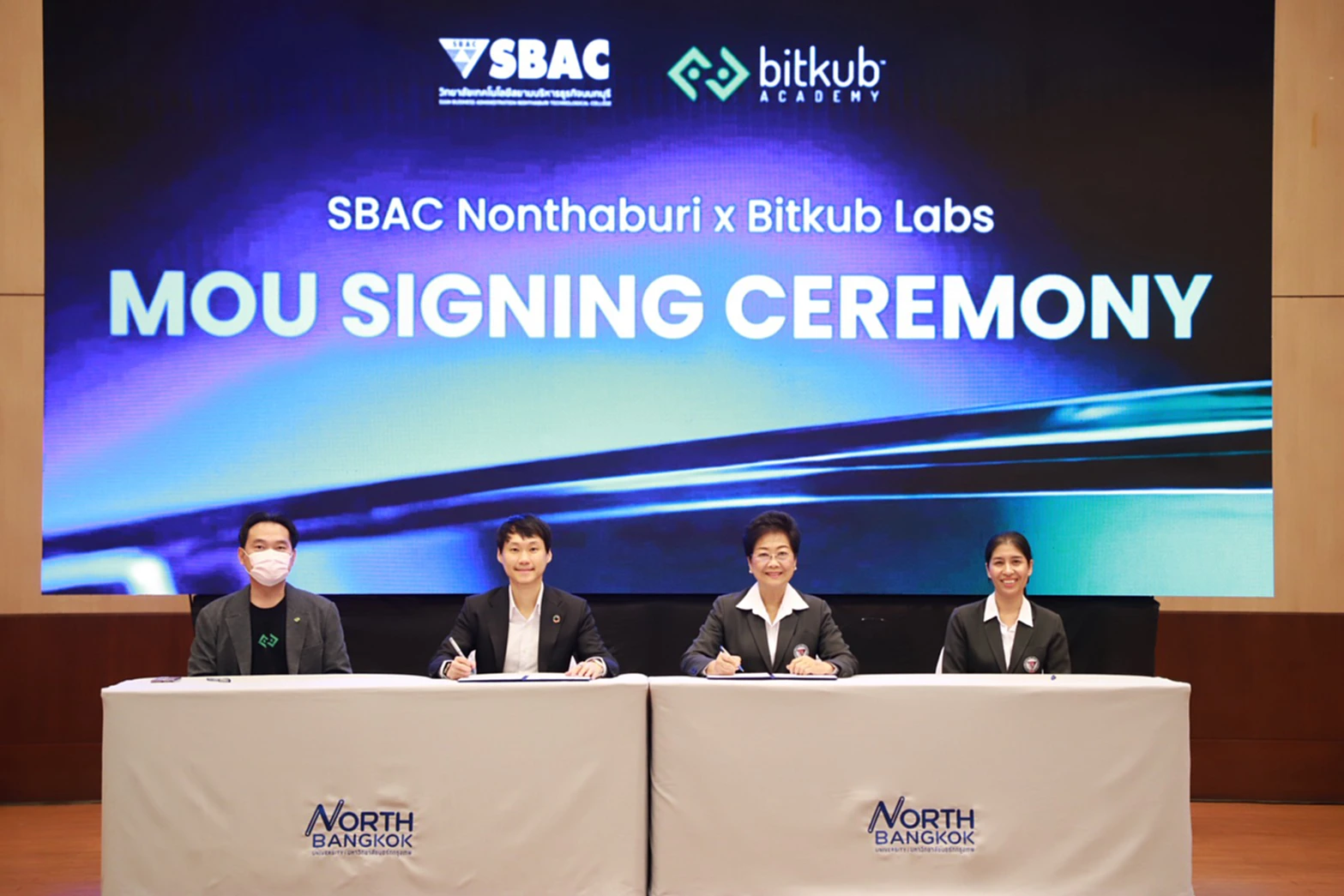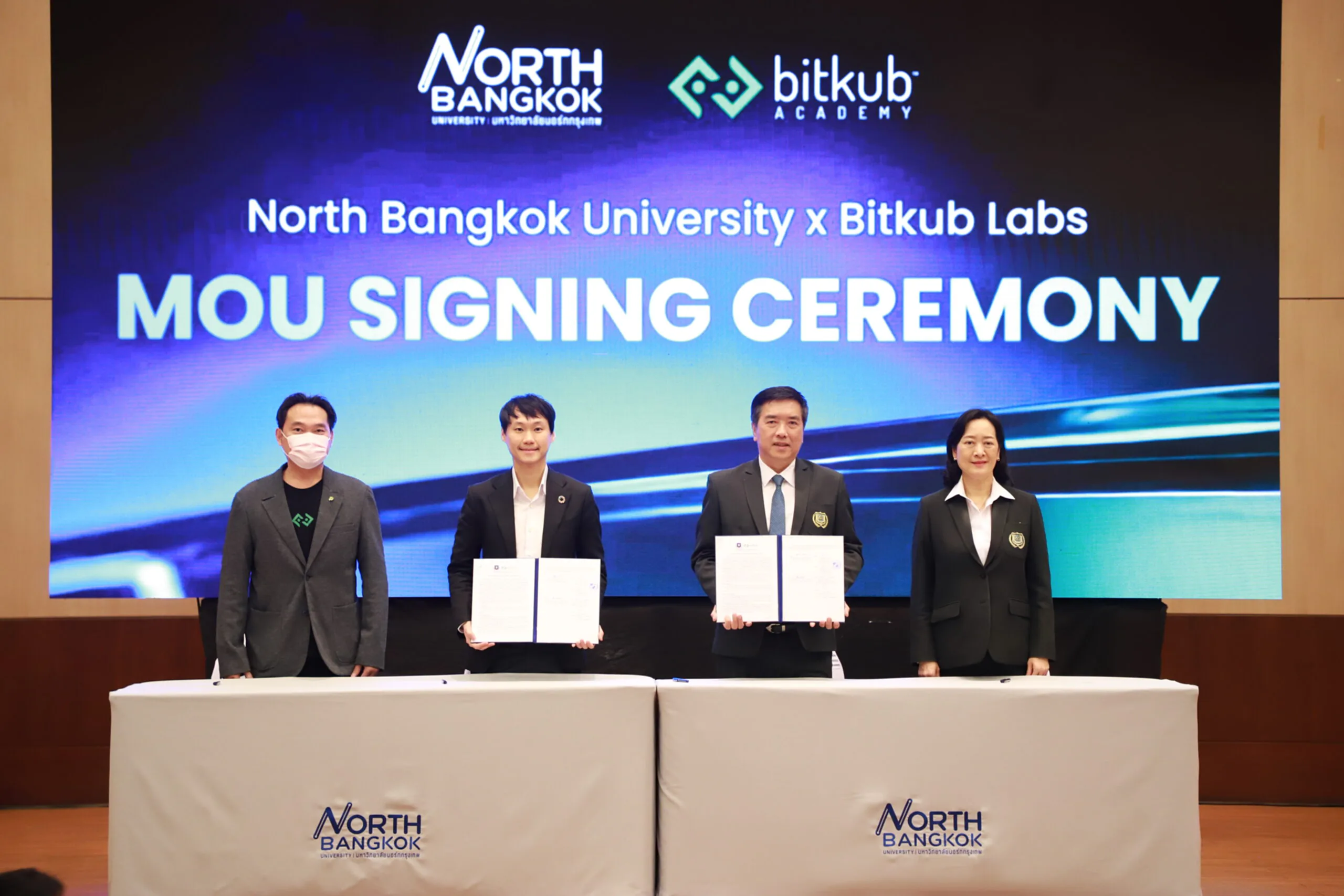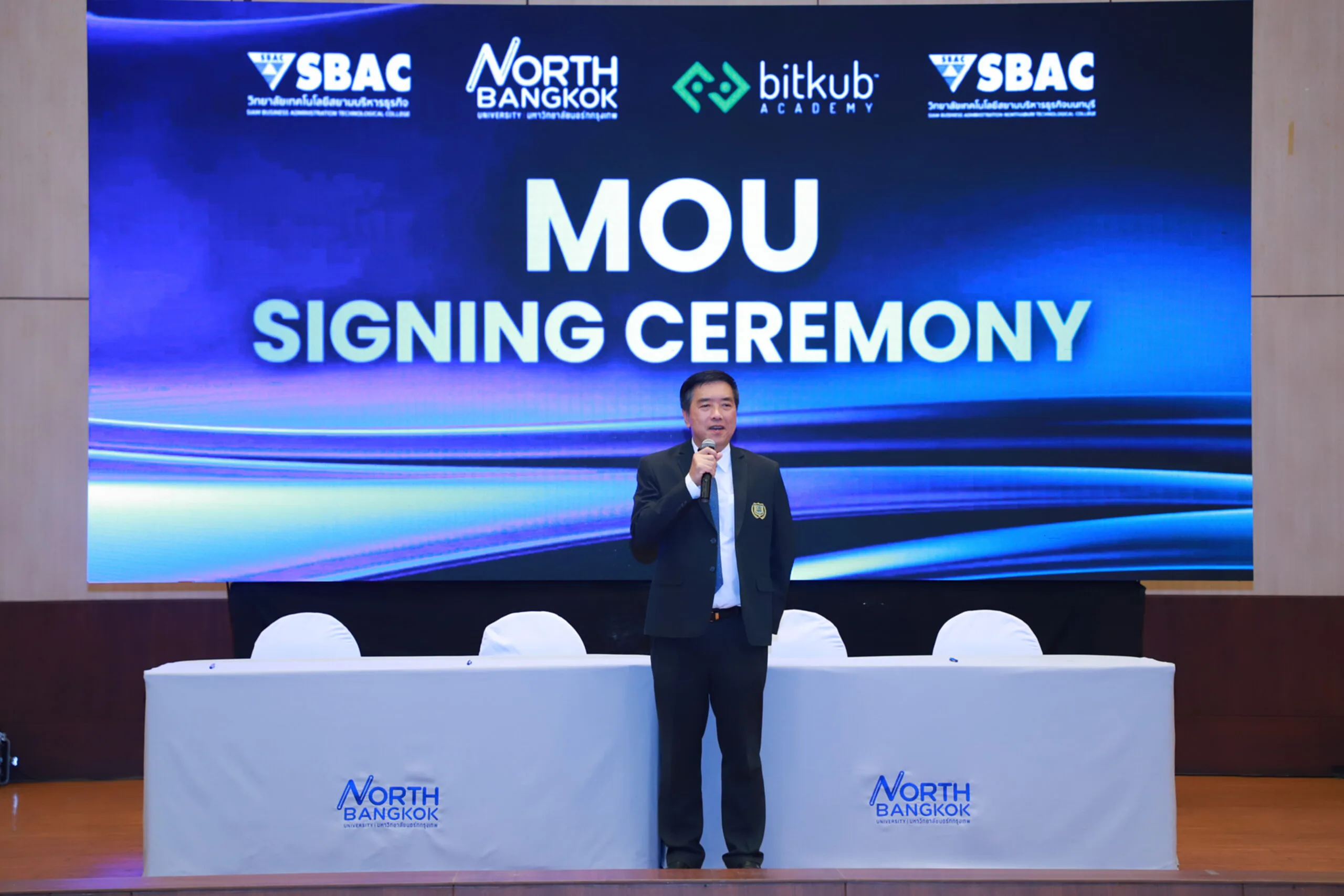 ที่ ห้องปทุมรัตน์ มหาวิทยาลัยนอร์ทกรุงเทพ วิทยาเขตรังสิต อ.ธัญบุรี จ.ปทุมธานี มหาวิทยาลัยนอร์ทกรุงเทพ (North Bangkok University) นำโดย ผู้ช่วยศาสตราจารย์ ดร.สิทธิพร ประวัติรุ่งเรือง อธิการบดีมหาวิทยาลัยนอร์ทกรุงเทพ พร้อมด้วย ดร.อิสริยา วรพิพัฒน์ ผู้อำนวยการวิทยาลัยเทคโนโลยีสยามบริหารธุรกิจ (SBAC สะพานใหม่) ดร.ปราศรัย ประวัติรุ่งเรือง ผู้อำนวยการวิทยาลัยเทคโนโลยีสยามบริหารธุรกิจ นนทบุรี (SBAC นนทบุรี) และ คุณท็อป จิรายุส ทรัพย์ศรีโสภา Co-Founder & Group Chief Executive Officer บริษัท บิทคับ แคปปิตอล กรุ๊ป โฮลดิ้งส์ จำกัด ผู้นำด้านธุรกิจสินทรัพย์ดิจิทัลและเทคโนโลยีบล็อกเชนของไทย ร่วมลงนามบันทึกข้อตกลงความร่วมมือ (MOU) อย่างเป็นทางการ ด้วยวิสัยทัศน์อันกว้างไกลในการยกระดับการศึกษา พัฒนาหลักสูตรให้สอดคล้องกับโลกยุคดิจิทัล และเสริมสร้างศักยภาพของนักศึกษาให้เป็นบุคลากรคุณภาพแห่งอนาคต
