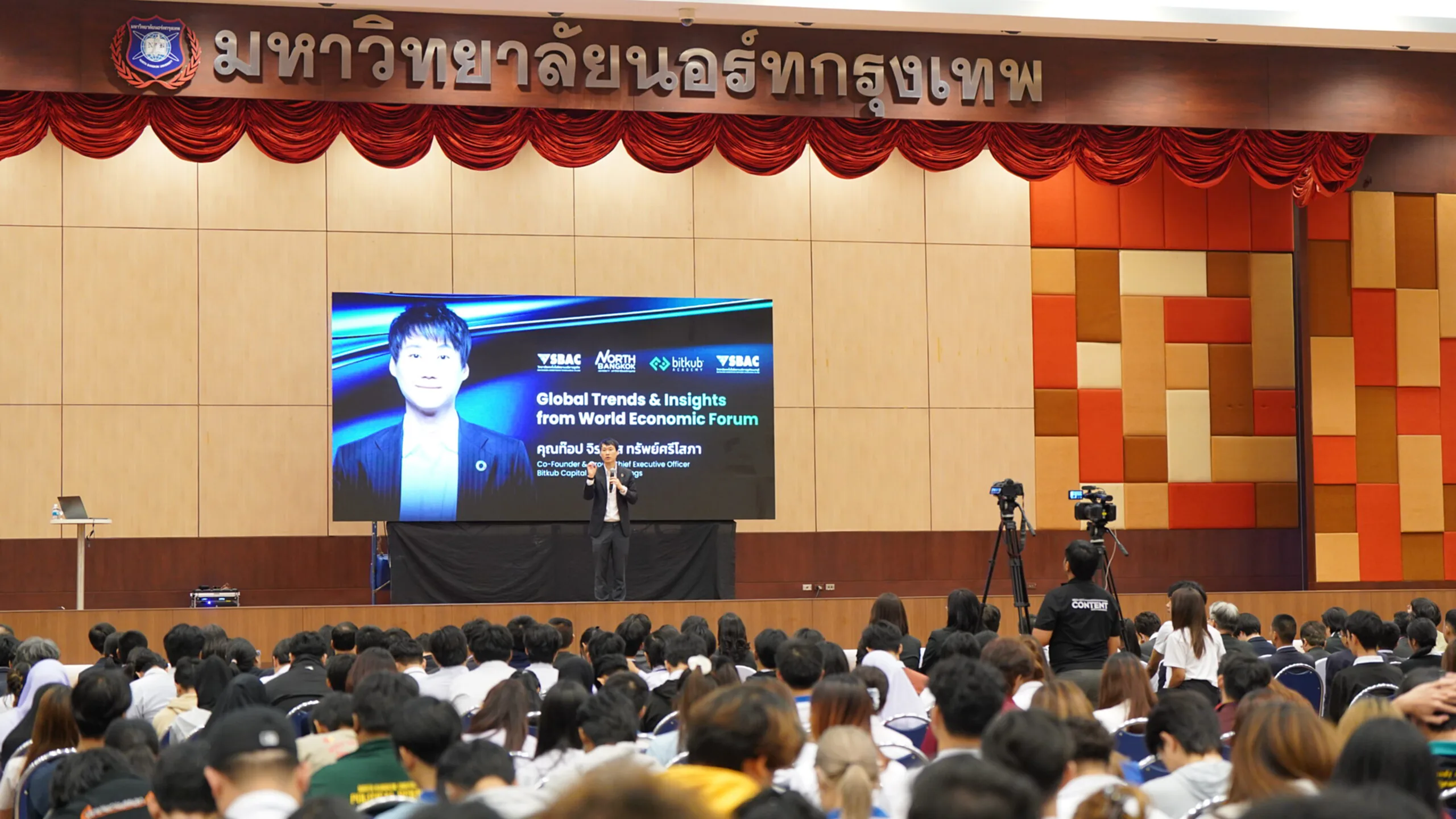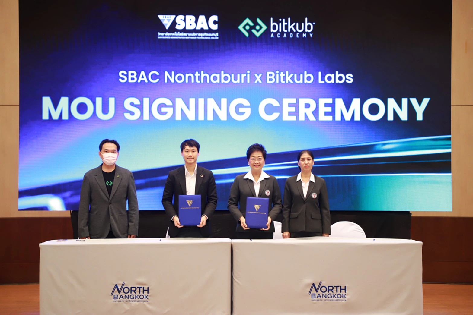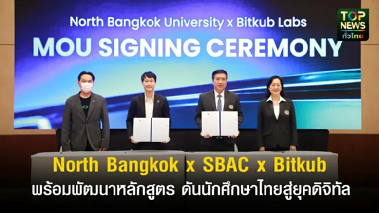 ที่ ห้องปทุมรัตน์ มหาวิทยาลัยนอร์ทกรุงเทพ วิทยาเขตรังสิต อ.ธัญบุรี จ.ปทุมธานี มหาวิทยาลัยนอร์ทกรุงเทพ (North Bangkok University) นำโดย ผู้ช่วยศาสตราจารย์ ดร.สิทธิพร ประวัติรุ่งเรือง อธิการบดีมหาวิทยาลัยนอร์ทกรุงเทพ พร้อมด้วย ดร.อิสริยา วรพิพัฒน์ ผู้อำนวยการวิทยาลัยเทคโนโลยีสยามบริหารธุรกิจ (SBAC สะพานใหม่) ดร.ปราศรัย ประวัติรุ่งเรือง ผู้อำนวยการวิทยาลัยเทคโนโลยีสยามบริหารธุรกิจ นนทบุรี (SBAC นนทบุรี) และ คุณท็อป จิรายุส ทรัพย์ศรีโสภา Co-Founder & Group Chief Executive Officer บริษัท บิทคับ แคปปิตอล กรุ๊ป โฮลดิ้งส์ จำกัด ผู้นำด้านธุรกิจสินทรัพย์ดิจิทัลและเทคโนโลยีบล็อกเชนของไทย ร่วมลงนามบันทึกข้อตกลงความร่วมมือ (MOU) อย่างเป็นทางการ ด้วยวิสัยทัศน์อันกว้างไกลในการยกระดับการศึกษา พัฒนาหลักสูตรให้สอดคล้องกับโลกยุคดิจิทัล และเสริมสร้างศักยภาพของนักศึกษาให้เป็นบุคลากรคุณภาพแห่งอนาคต
