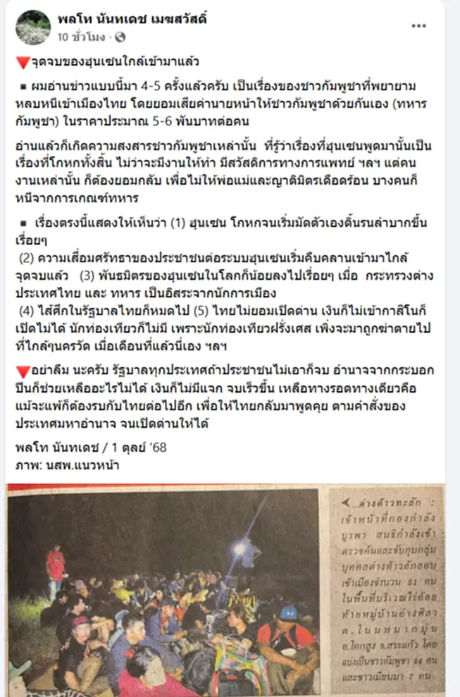 เมื่อวันที่ 2 ตุลาคม 2568 พลโท นันทเดช เมฆสวัสดิ์ ได้โพสต์ข้อความผ่านเฟซบุ๊ก โดยระบุว่า  🔻จุดจบของฮุนเซนใกล้เข้ามาแล้ว