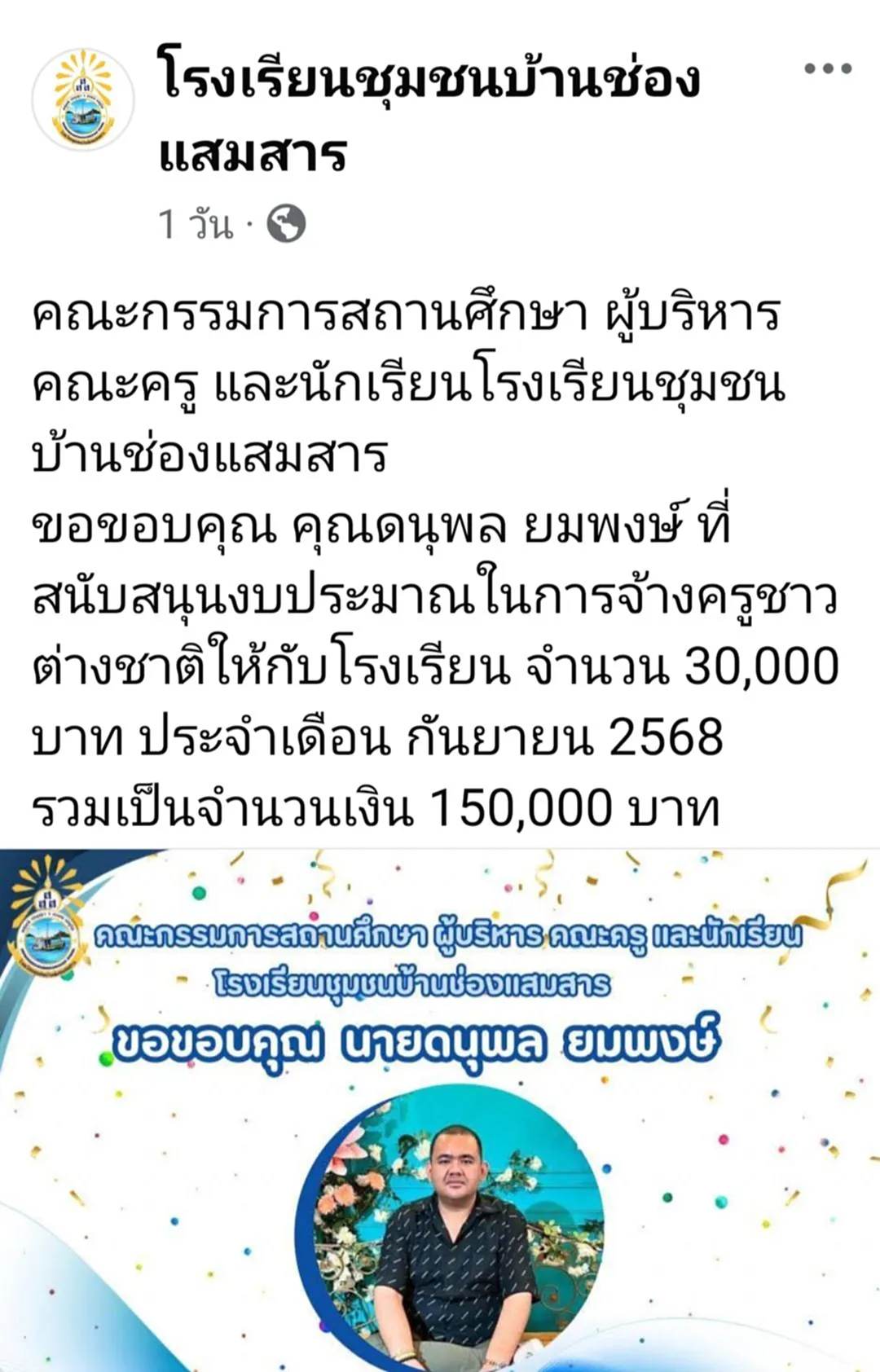 คณะกรรมการสถานศึกษา ผู้บริหาร ครู และนักเรียน ต่างออกมาขอบคุณ “เสี่ยเบล แสมสาร” ที่ไม่เพียงแต่ช่วยเหลือด้านการศึกษา แต่ยังสร้างแรงบันดาลใจให้เห็นถึงน้ำใจและความห่วงใยต่อชุมชน