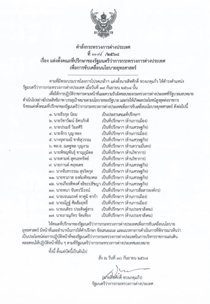 เมื่อวันที่ 2 ตุลาคม 2568 ผู้สื่อข่าวรายงานจากกระทรวงการต่างประเทศว่า เมื่อวันที่ 30 กันยายน ที่ผ่านมา นายสีหศักดิ์ พวงเกตุแก้ว รมว.ต่างประเทศ ได้ลงนามในคำสั่งกระทรวงการต่างประเทศที่ ๑๑๙๕ /๒๕๖๘ เเรื่อง แต่งตั้งคณะที่ปรึกษาของรัฐมนตรีว่าการกระทรวงการต่างประเทศเพื่อการขับเคลื่อนนโยบายยุทธศาสตร์