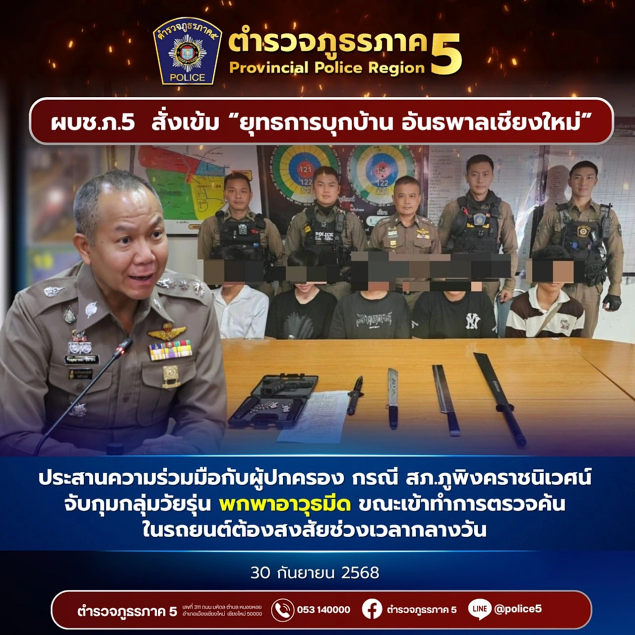 ผบช.ภ.5 สั่งเข้ม "ยุทธการบุกบ้าน อันธพาลเชียงใหม่” ประสานความร่วมมือกับผู้ปกครอง กรณี สภ.ภูพิงคราชนิเวศน์ จับกุมกลุ่มวัยรุ่นพกพาอาวุธมีดขณะเข้าทำการตรวจค้นในรถยนต์ต้องสงสัยช่วงเวลากลางวัน
