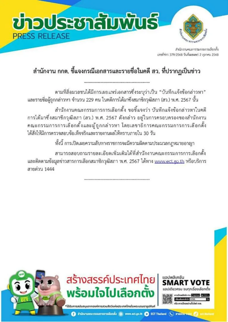 2 ต.ค.2568 สำนักงานคณะกรรมการการเลือกตั้ง (กกต.) ได้ออกเอกสารชี้แจงกรณีมีการเผยแพร่เอกสารซึ่งระบุว่าเป็น “บันทึกแจ้งข้อกล่าวหา” และรายชื่อผู้ถูกกล่าวหา จำนวน 229 คน ในคดีการได้มาซึ่งสมาชิกวุฒิสภา (สว.) พ.ศ.2567