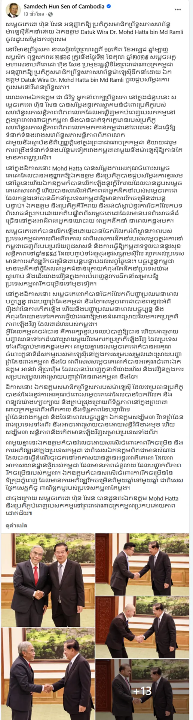 เมื่อวันที่ 2 ตุลาคม 2568 นายฮุน เซน ประธานวุฒิสภากัมพูชา โพสต์เฟซบุ๊กขณะให้การต้อนรับคณะผู้แทนวุฒิสมาชิกสหพันธรัฐมาเลเซีย และคณะผู้แทนจากสหพันธ์สมัชชาสันติภาพโลกเข้าเยี่ยมคาราวะ ณ ทำเนียบวุฒิสภาเมื่อช่วงบ่ายที่ผ่านมา จากนั้นนายฮุนเซนได้กล่าวถึงสถานการณ์ในกัมพูชาในอดีตที่ตนเองทำให้กัมพูชาหลุดพ้นจากระบอบการฆ่าล้างเผ่าพันธุ์ รวมถึงการสร้างสันติภาพในปี พ.ศ. 2541 และสามารถยุติสงครามกลางเมืองได้อย่างสมบูรณ์ กระทั่งประเทศยังคงพัฒนาและเจริญรุ่งเรืองมาถึงทุกวันนี้