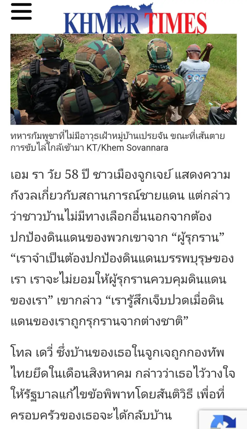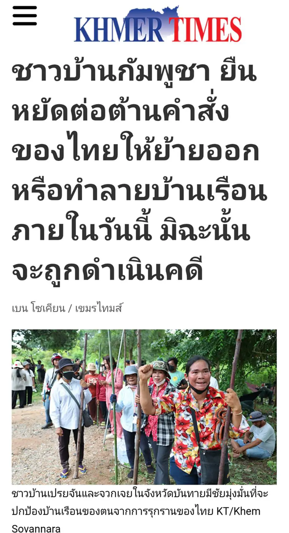 ล่าสุด วันนี้ ( 3 ก.ย.) มีรายงานว่าสื่อออนไลน์ “khmer times” (ขเเมร์ ไทม์) ได้นำเสนอข่าว กรณีชาวกัมพูชา ที่จังหวัดบันเตียเมียนเจย ยืนยันจะไม่ยอมย้ายออกจากพื้นที่ แม้จะเข้าใกล้กำหนดเส้นตาย ที่ทางการกำหนดไว้ว่า จะทำการผลักดันออกจากพื้นที่ของไทย โดยชาวบ้านกัมพูชา ยืนยันว่า พร้อมจะปกป้องทรัพย์สินของตน แม้ฝ่ายไทยจะขู่รื้อถอนหากไม่ปฏิบัติตามคำสั่ง แม้จะต้องแลกด้วยชีวิตก็ตาม