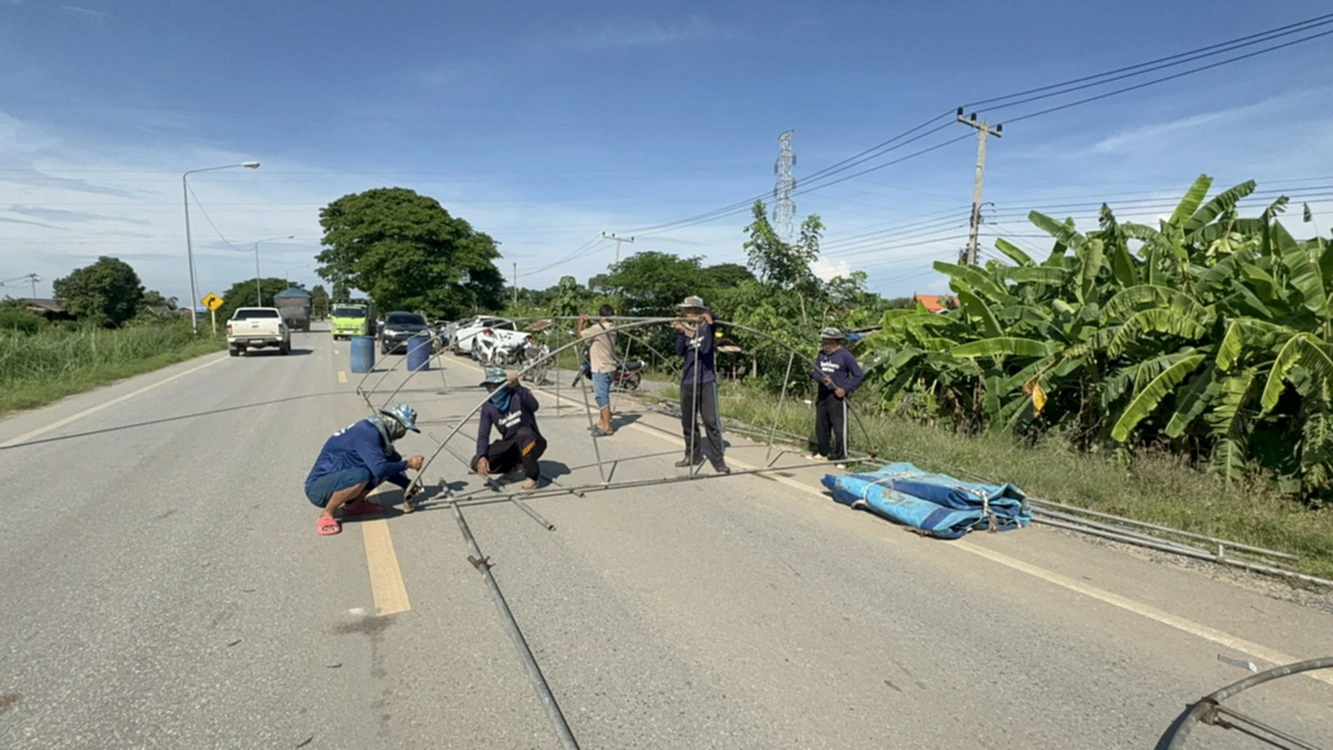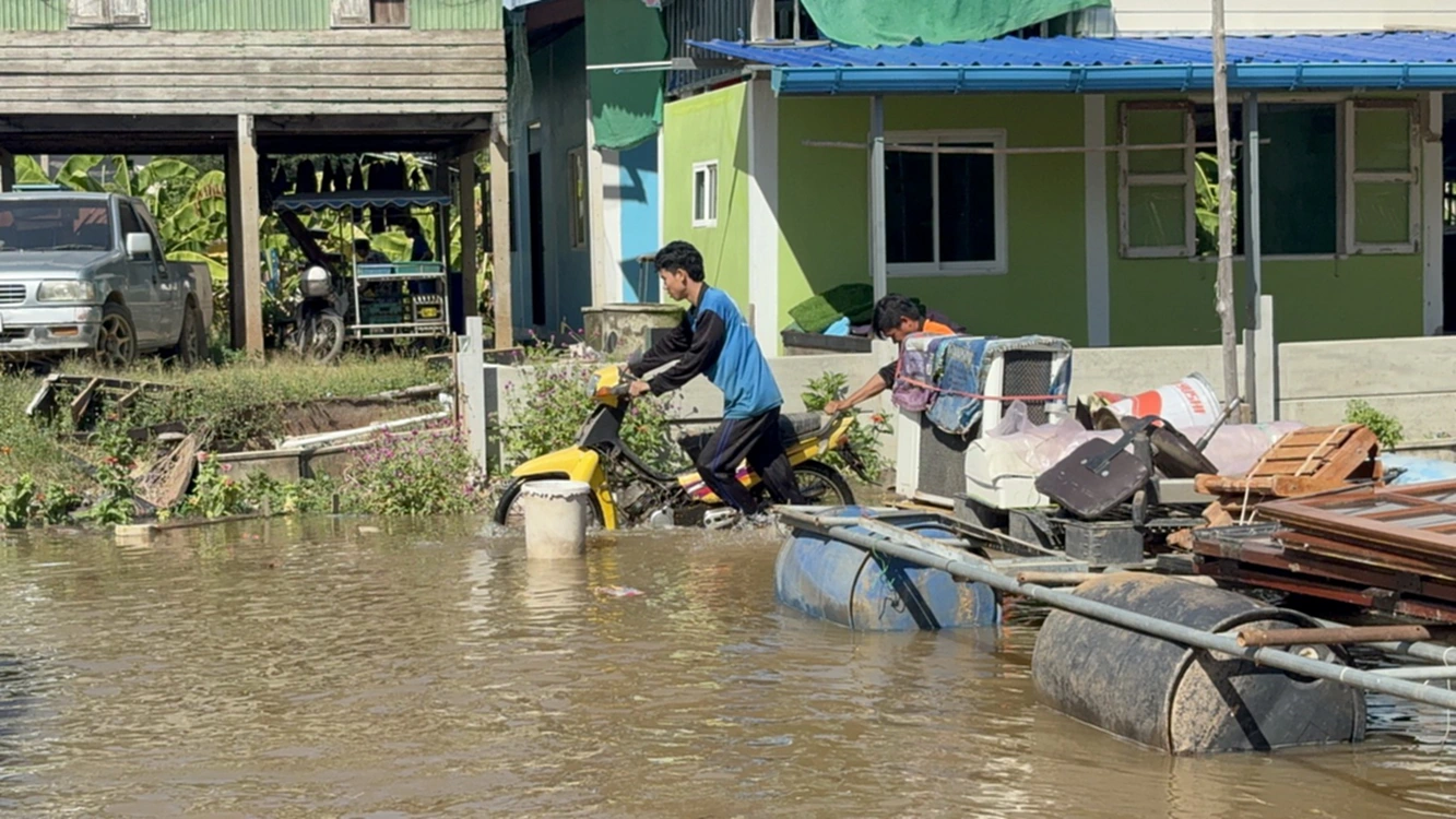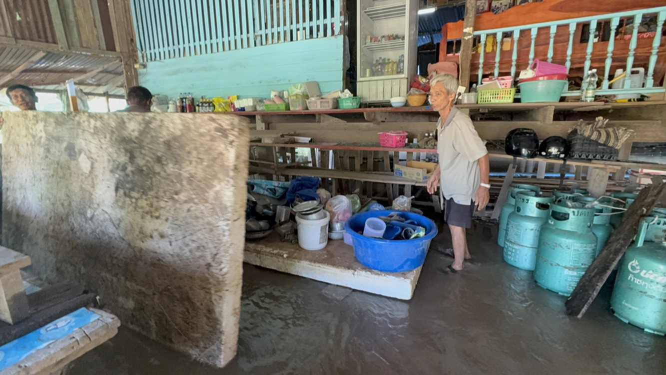 คันกั้นน้ำโผงเผงพัง ผู้ใหญ่บ้านพร้อมผู้ต้องขัง ตั้งเต็นท์ให้ชาวบ้าน นายก อบต. ลุยวางบิ๊กแบ็ค