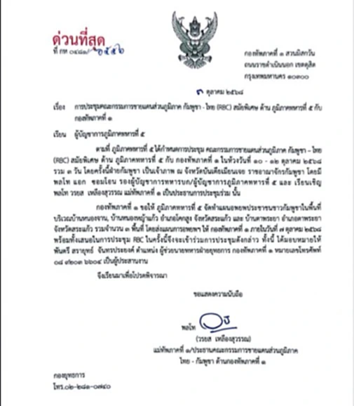 หนังสือด่วนที่สุด "แม่ทัพภาคที่ 1" ไทย ตอบกลับ ผบ.ทหารที่ 5 เขมร ต้องทำแผนอพยพภายใน 7 ต.ค.นี้ จึงจะร่วมประชุม RBC