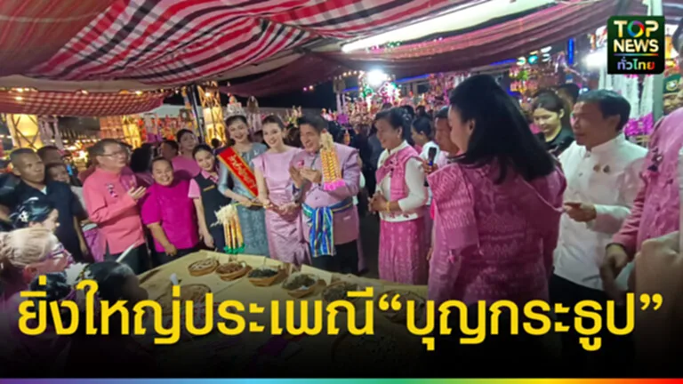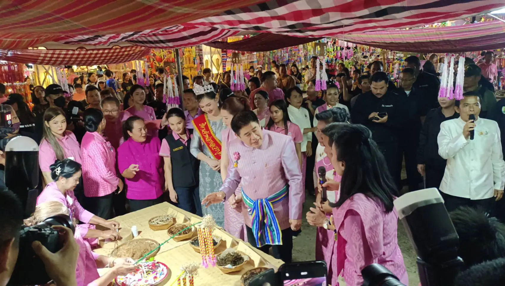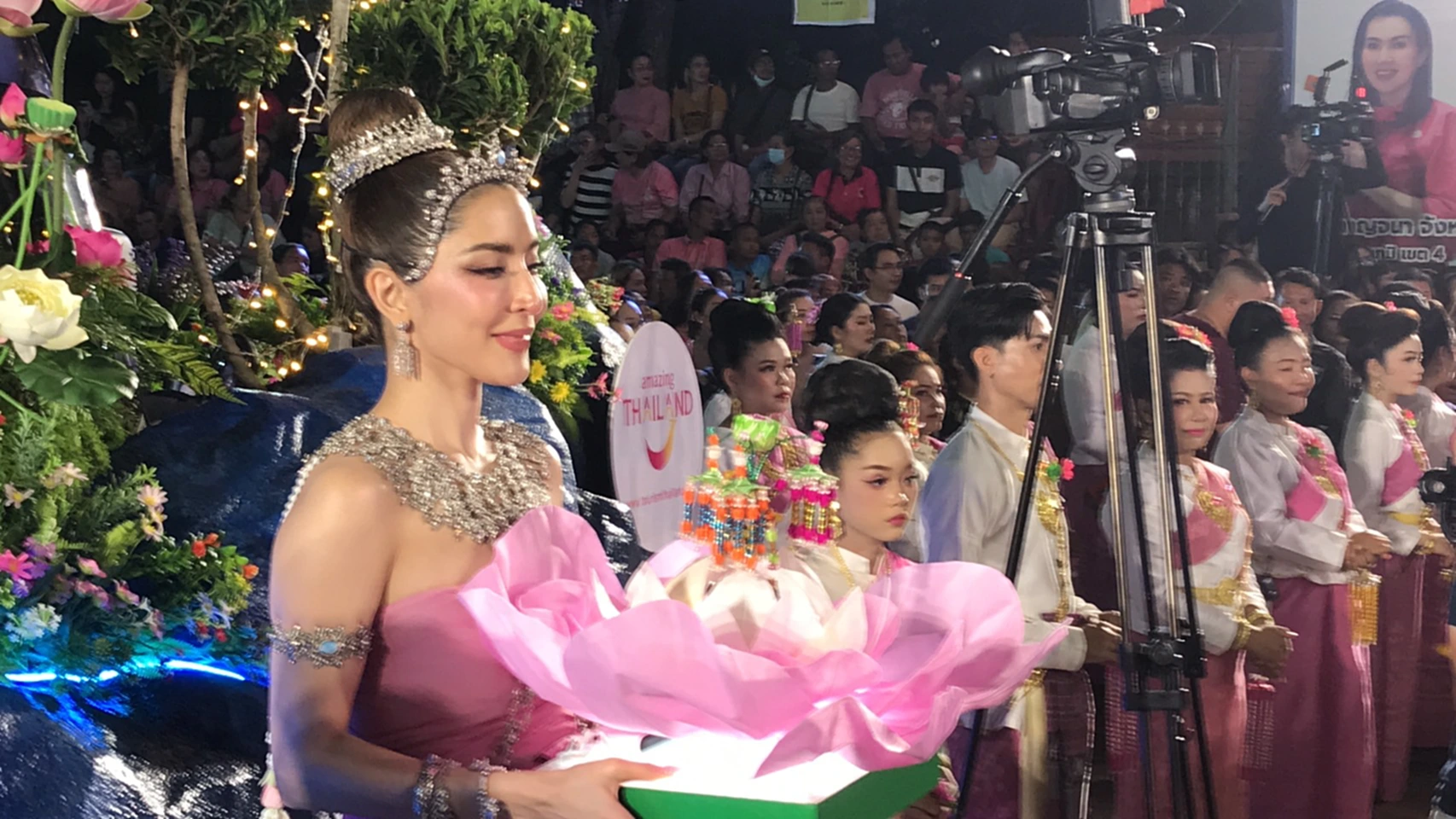 พิ้งกี้ ดาราสาวเชิญพานดอกบัวแด่ รองนายกฯ เปิดงานประเพณีบุญกระธูปสุดยิ่งใหญ่ นักท่องเที่ยวนับหมื่นแห่ชมพิธีและต้นกระธูปสุดคึกคัก