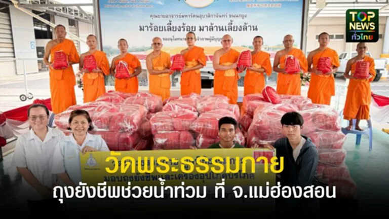 วันที่ 4 ตุลาคม 2568 ณ ศาลามหาทานบารมี อาคารครัว 71 ปี วัดพระธรรมกาย จังหวัดปทุมธานี พระครูปลัดรัตนวีรวัฒน์ เจ้าอาวาสวัดพระธรรมกาย มอบหมายให้พระมหานพพร ปุญฺญชโย ป.ธ.9 ผู้ช่วยเจ้าอาวาสวัดพระธรรมกาย พร้อมด้วยพระธีระพัฒน์ กุลธีโร หัวหน้าสำนักงานประสานงานเครือข่ายภายในประเทศ ผู้แทนมูลนิธิธรรมกาย และคณะศิษยานุศิษย์วัดพระธรรมกาย ส่งมอบถุงยังชีพบรรจุข้าวสารอาหารแห้งจำนวนทั้งสิ้น 600 ชุด รวมเป็นน้ำหนัก 2,100 กิโลกรัม เพื่อนำไปช่วยเหลือคณะสงฆ์และประชาชนผู้ได้รับความเดือดร้อนจากสถานการณ์อุทกภัยในจังหวัดแม่ฮ่องสอน เป็นสาธารณสงเคราะห์