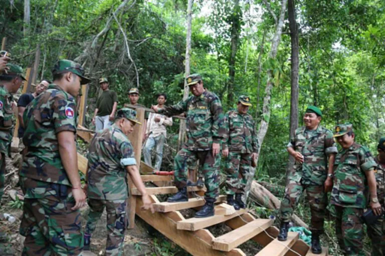 พลเอก ก็วน กีม ตรวจสอบการก่อสร้างถนนและบันไดขึ้นไปยังปราสาทคนา บนเทือกเขาพนมดงรัก