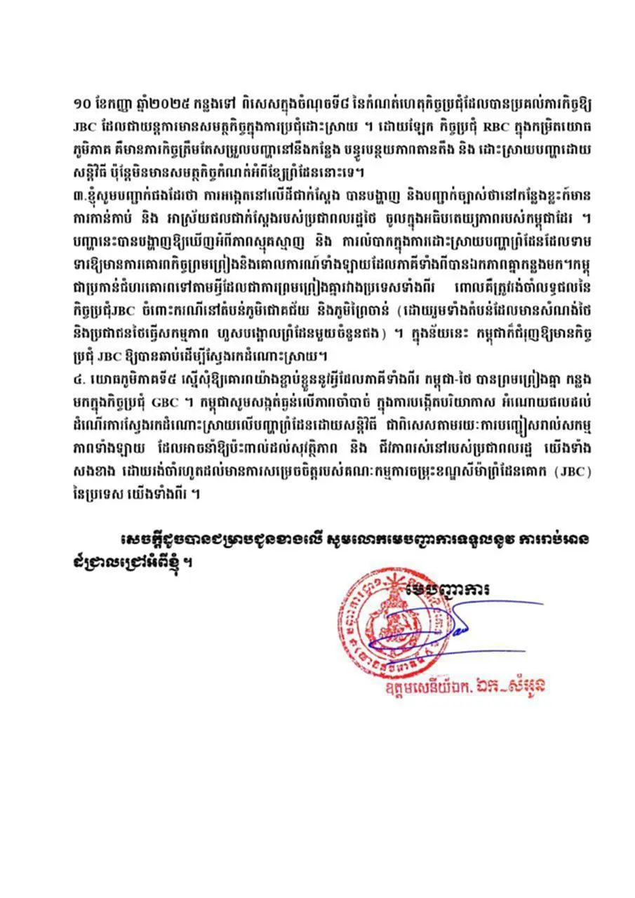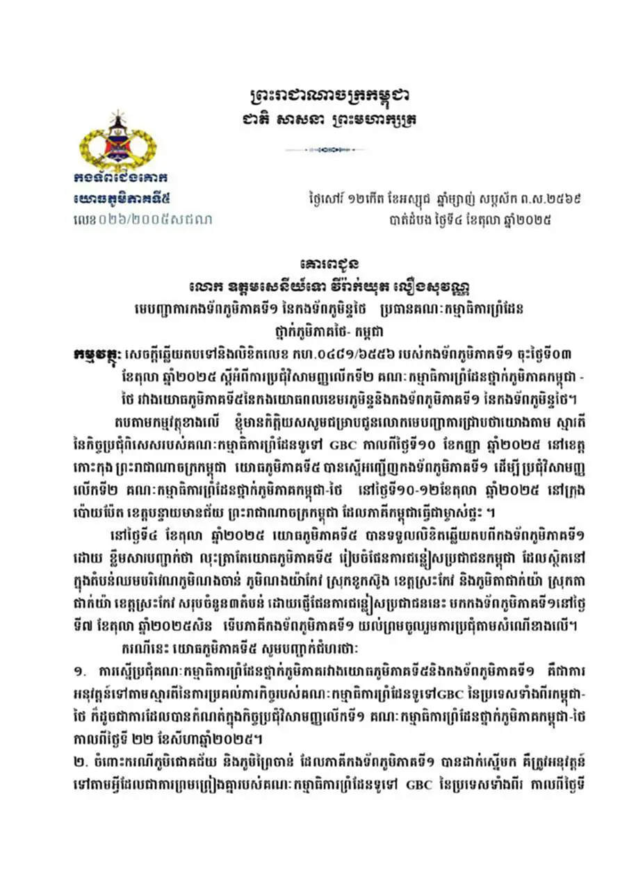 โดยแถลงการณ์ระบุว่า “ข้าพเจ้ารู้สึกเป็นเกียรติที่จะแจ้งให้ผู้บัญชาการทราบว่า ตามเจตนารมณ์ของการประชุมพิเศษของคณะกรรมการชายแดนทั่วไป หรือ GBC เมื่อวันที่ 10 กันยายน 2568 ณ จังหวัดเกาะกง ราชอาณาจักรกัมพูชา กองกำลังภูมิภาคทหารที่ 5 ได้ขอเชิญกองทัพภาคที่ 1 เข้าร่วมการประชุมพิเศษครั้งที่ 2 ของGBC ระหว่างวันที่ 10-12 ตุลาคม 2568 ณ เมืองปอยเปต จังหวัดบันเตียเมียนเจย ราชอาณาจักรกัมพูชา ซึ่งฝ่ายกัมพูชาเป็นเจ้าภาพ