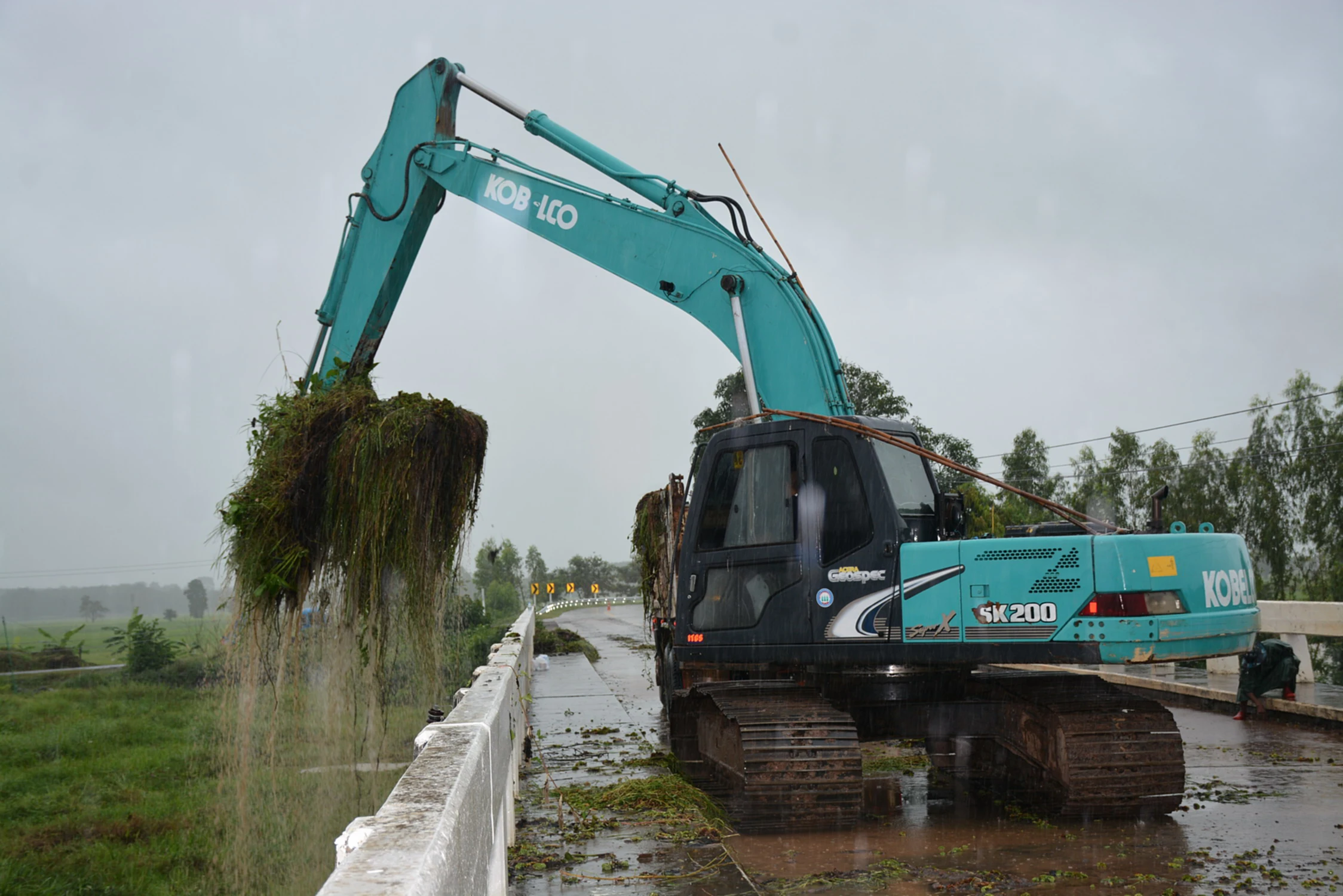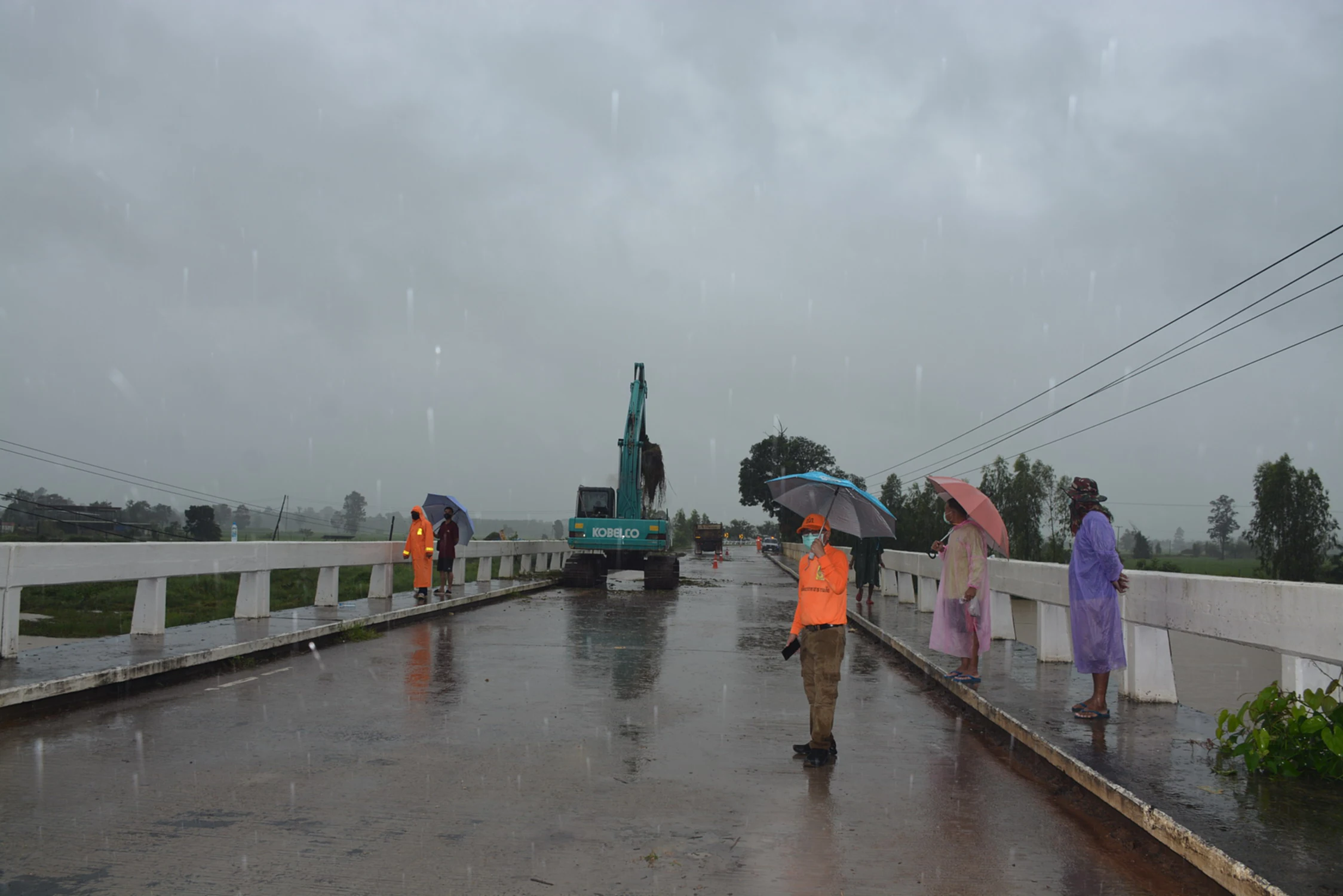 วันที่ 18 ต.ค. 2564 ผู้สื่อข่าวรายงานว่า ที่สะพานห้วยกระโดน ต.ตะเคียนราม อ.ภูสิงห์ จ.ศรีสะเกษ นายนิคม วงศ์ก่อ หน.สนง.ปภ.สาขากันทรลักษ์ พร้อมด้วย นายเศกสรรค์ ขจรโมทย์ ปลัด อ.ภูสิงห์ และ นายศิริพงษ์ กุลวงษ์ กำนัน ต.ตะเคียนราม ได้ร่วมกับส่วนราชการที่เกี่ยวข้องนำเอารถแบ็คโฮและรถบรรทุก 10 ล้อ ไปทำการขุดลอกกำจัดวัชพืชออกจากบริเวณใต้สะพานแห่งนี้ เนื่องจากว่า วัชพืชไหลมากับน้ำป่าที่ไหลมาจากเขื่อนห้วยติ๊กชูและหนองแบกชะนังไหลลงมารวมกันปิดทางน้ำไหลบริเวณสะพานแห่งนี้ ส่งผลให้น้ำเอ่อล้นเข้าไปท่วมไร่นาบ้านเรือนของชาวบ้านในเขต ต.ตะเคียนราม โดยรถแบ็คโฮได้ตักเอาวัชพืชขึ้นมาจากน้ำใส่รถบรรทุก 10 ล้อ เพื่อนำเอาไปกองไว้บริเวณข้างสะพานห้วยกระโดนจนแล้วเสร็จ ทำให้น้ำไหลผ่านบริเวณนี้ได้สะดวก ส่งผลให้ระดับน้ำท่วมไร่นาของชาวบ้านเริ่มลดระดับลง โดยมีชาวบ้านมาช่วยกันคอยอำนวยความสะดวกให้กับรถทุกชนิดที่ผ่านไปมาบริเวณนี้ระหว่างที่รถแบ็คโฮกำลังขุดลอกวัชพืชขึ้นมาจากน้ำ
