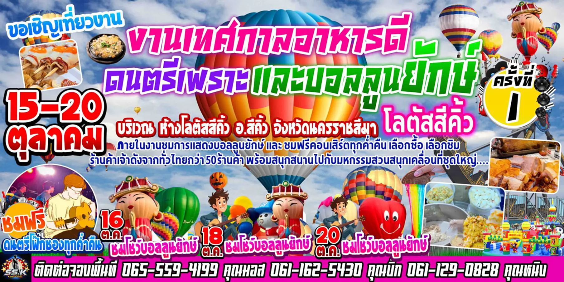 โคราชคึกคัก เทศกาล “อาหารดี ดนตรีเพราะ บอลลูนยักษ์” บุกสีคิ้ว 15–20 ต.ค. นี้ ชวนชมฟรีคอนเสิร์ต–บอลลูนลอยฟ้าสุดอลังการ