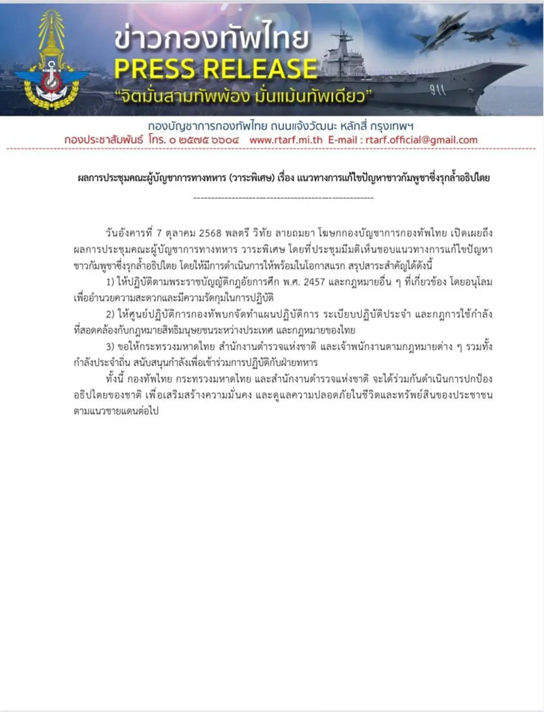 วันอังคารที่ 7 ตุลาคม 2568 พลตรี วิทัย ลายถมยา โฆษกกองบัญชาการกองทัพไทย เปิดเผยถึง ผลการประชุมคณะผู้บัญชาการทางทหาร (วาระพิเศษ) โดยที่ประชุมมีมติเห็นชอบแนวทางการแก้ไขปัญหาชาวกัมพูชาซึ่งรุกล้ำอธิปไตย โดยให้มีการดำเนินการให้พร้อมในโอกาสแรก สรุปสาระสำคัญได้ดังนี้