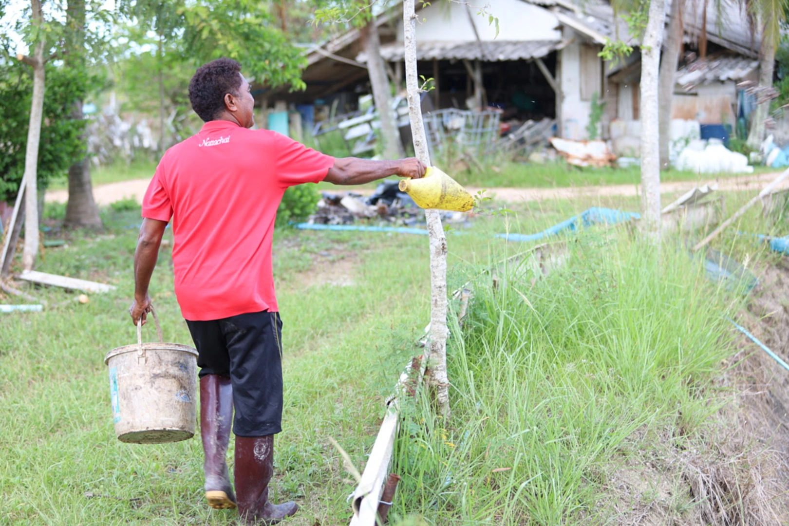 ในฟาร์มของนายณัฏฐชัยมีทั้งหมด 7 บ่อ ใช้ปลาหมอคางดำไม่ต่ำกว่า 50 กิโลกรัมต่อฟาร์ม ส่วนกลุ่มวิสาหกิจชุมชนผู้เลี้ยงปูขาวที่มีสมาชิกกว่า 30 ราย ครอบคลุมพื้นที่กว่า 300 ไร่ ใช้ปลาหมอคางดำรวมกันวันละไม่ต่ำกว่า 600-900 กิโลกรัม ซึ่งสามารถลดต้นทุนค่าอาหารจากเดิมที่ต้องซื้อปลาทะเลกิโลกรัมละ 14 บาท เหลือเพียง 10 บาทต่อกิโลกรัม จากการรับซื้อปลาหมอคางดำจากชาวบ้านในพื้นที่ ซึ่งยังช่วยสร้างรายได้เสริมให้กับชุมชนอีกทางหนึ่ง สำหรับเรื่องความปลอดภัยและการควบคุมการแพร่กระจายของไข่ปลาหมอคางดำ นายณัฏฐชัยได้อ้างอิงงานวิจัยของมหาวิทยาลัยเทคโนโลยีราชมงคลศรีวิชัย (มทร.ศรีวิชัย) วิทยาเขตไสใหญ่ ที่ระบุชัดว่า การแช่ปลาหมอคางดำในตู้แช่แข็งอุณหภูมิ -20 องศาเซลเซียส เป็นเวลา 24 ชั่วโมง จะสามารถทำลายไข่ปลาได้อย่างสมบูรณ์ ไม่ให้เกิดการแพร่พันธุ์ในบ่อเลี้ยง ส่วนในกรณีไม่มีตู้แช่แข็ง อาจใช้วิธีแช่น้ำแข็งนาน 3 วันแทน