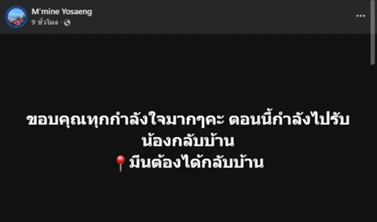 ล่าสุดมีผู้ใช้เฟซบุ๊กชื่อว่า “M’mine Yosaeng” ซึ่งชื่อ น.ส.มายด์ เป็นพี่สาวของ นาย เมธาชาญ ยอแสง หรือ มีน โพสต์ข้อความระบุว่า “ขอบคุณทุกกำลังใจมากๆ คะ ตอนนี้กำลังไปรับน้องกลับบ้าน มีนต้องได้กลับบ้าน”