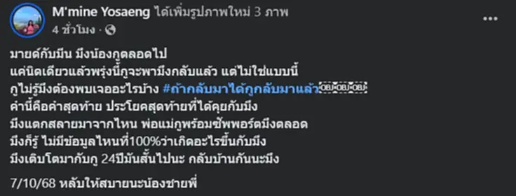 จากนั้นโพสต์ข้อความไว้อาลัยว่า “มายด์กับมีน มึงน้องกูตลอดไป แค่นิดเดียวแล้วพรุ่งนี้กูจะพามึงกลับแล้ว แต่ไม่ใช่แบบนี้ กูไม่รู้มึงต้องพบเจออะไรบ้าง #ถ้ากลับมาได้กูกลับมาแล้ว คำนี้คือคำสุดท้าย ประโยคสุดท้ายที่ได้คุยกับมึง มึงแตกสลายมาจากไหน พ่อแม่กูพร้อมซัพพอร์ตมึงตลอด มึงก็รู้ ไม่มีข้อมูลไหนที่100% ว่าเกิดอะไรขึ้นกับมึง มึงเติบโตมากับกู 24ปีมันสั้นไปนะ กลับบ้านกันนะมึง 7/10/68 หลับให้สบายนะน้องชายพี่”