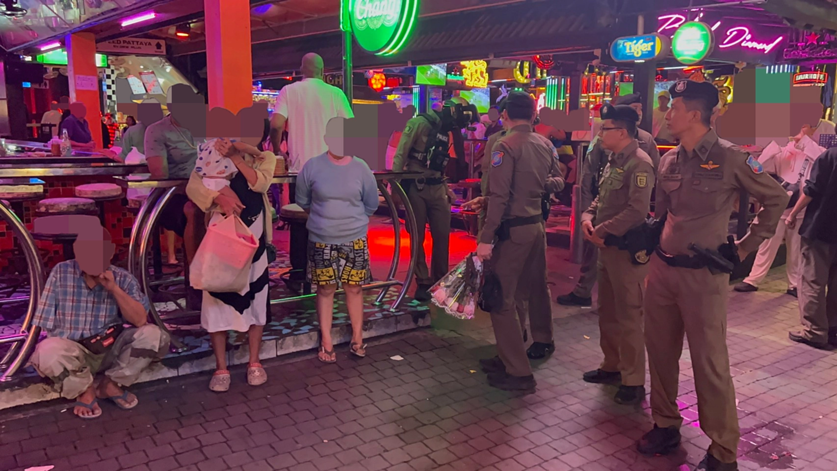 เมื่อเวลา 03.36 น. วันที่ 8 ตุลาคม 2568 พ.ต.ท.สิริวัฒน์ คัชมาตย์ รองผกก.ป.สภ.พัทยา พ.ต.ท.ต่อลาภ ตินะมาตร สวญ.ส.ทท.4 กก.2 บก.ทท.1 พ.ต.ท.สุชาติ ดุสดี สวป.สภ.เมืองพัทยา ร.ต.อ.อิงควัชร์ เกรียงสินกุลยศ รอง สว.ตม.จว.ชลบุรี สนธิกำลัง เจ้าหน้าที่ตำรวจ สภ.เมืองพัทยา เจ้าหน้าที่ตำรวจท่องเที่ยวเมืองพัทยา เจ้าหน้าที่ตำรวจตรวจคนเข้าเมือง เจ้าหน้าที่กิจการพิเศษเมืองพัทยา ปล่อยแถวออกตรวจสอบกลุ่มบุคคลต่างด้าวแย่งอาชีพคนไทย ขอทาน รวมไปถึงการลักลอบกระทำผิดกฎหมายในถนนคนเดิน วอล์กกิ้งสตรีท พัทยาใต้