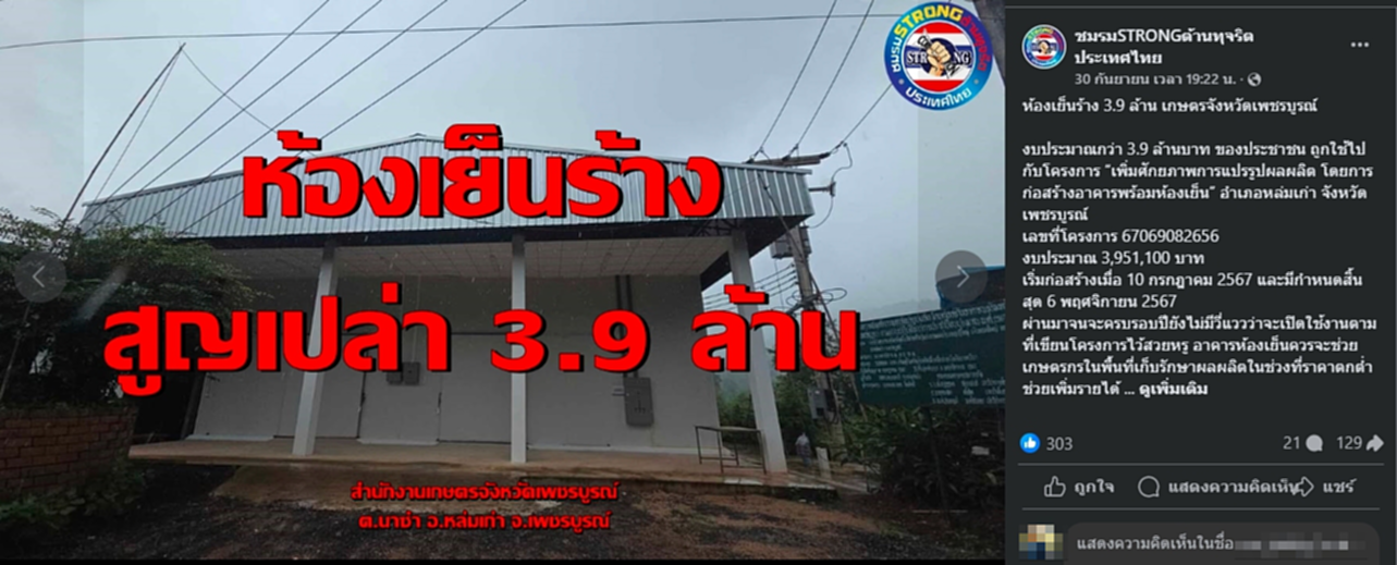เมื่อวันที่ 7 ตุลาคม 2568 นายธนกฤต เลิศวิริยวรางกูร ผู้อำนวยการสำนักงาน ป.ป.ช. ประจำจังหวัดเพชรบูรณ์ พร้อมเจ้าหน้าที่กลุ่มงานป้องกันการทุจริต และสื่อมวลชนท้องถิ่น ลงพื้นที่ติดตามข้อเท็จจริงกรณีเพจ ชมรม Strong ต้านทุจริต ประเทศไทย เผยแพร่ข้อความ “#ห้องเย็นร้าง สูญเปล่า 3.9 ล้าน” ซึ่งพาดพิงถึงโครงการก่อสร้างอาคารพร้อมห้องเย็นของสำนักงานเกษตรจังหวัดเพชรบูรณ์