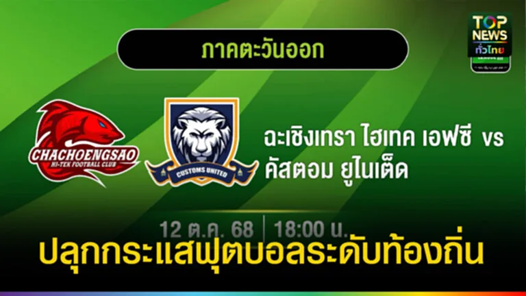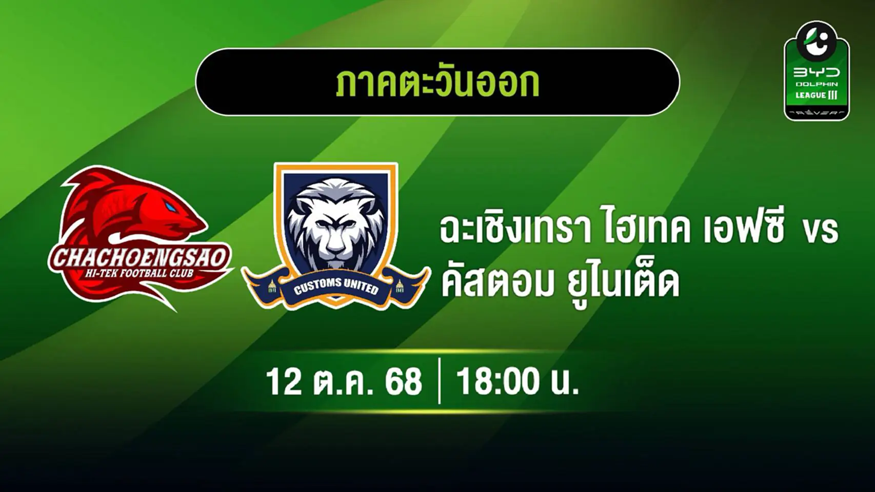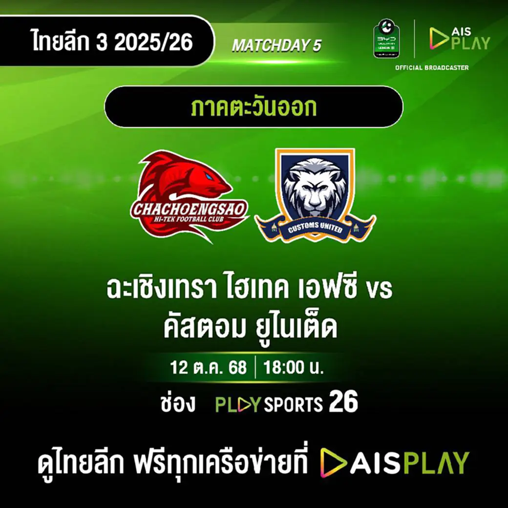 เดินทางไปยังโซนภาคตะวันออกคู่ที่น่าสนใจของโซนนี้ ต้องไปดูเกมในวันอาทิตย์ที่ 12 ตุลาคม เวลา 18.00 น. ที่สนามกีฬาเทศบาลเมืองฉะเชิงเทรา “ปลากัดนักสู้” ฉะเชิงเทรา ไฮเทค เอฟซี บ๊วยของตาราง จะต้องเปิดบ้านเจอกับทีมลุ้นแชมป์อย่าง “สิงห์นายด่าน” คัสตอม ยูไนเต็ด คู่นี้ยิงสดผ่าน AIS PLAY SPORTS 26 ให้แฟนๆ ได้รอรับชมกัน