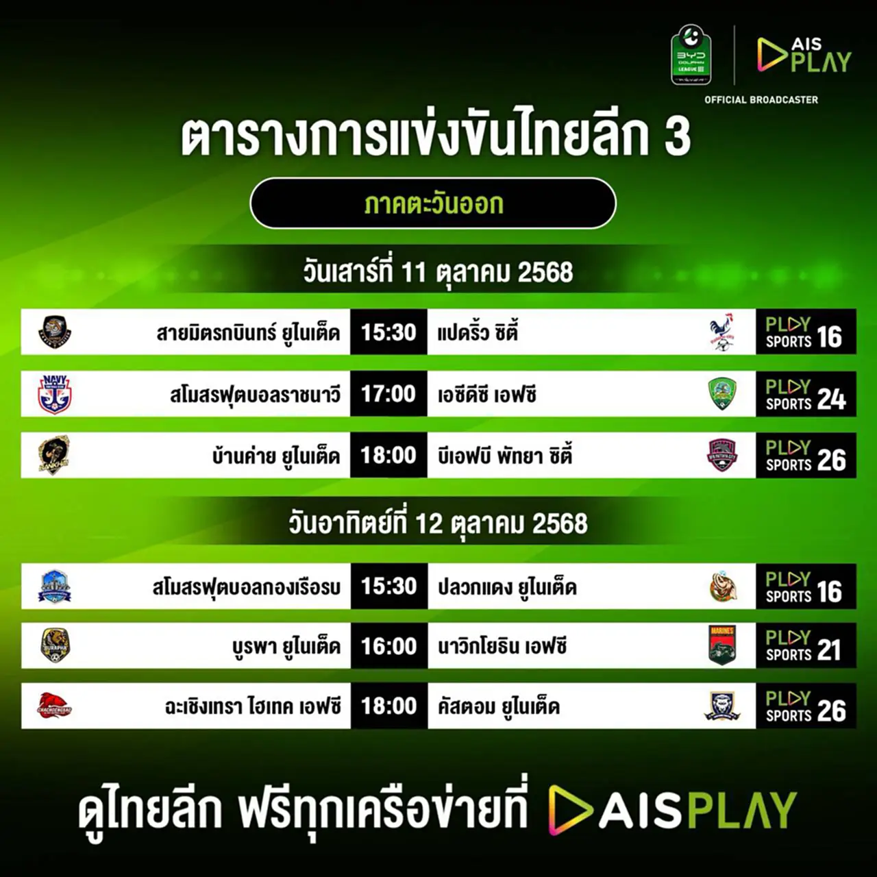 AIS ขอเชิญแฟนฟุตบอลชาวไทยทุกคน ร่วมส่งแรงเชียร์ผ่านช่องทางรับชมที่ถูกลิขสิทธิ์ เพื่อสนับสนุนวงการฟุตบอลไทยอย่างสร้างสรรค์ โดยสามารถชมได้ฟรีทุกเครือข่าย ถ่ายทอดสดครบทุกลีก ที่แอปพลิเคชัน AIS PLAY กล่อง AIS PLAYBOX, Smart TV, Android TV, Apple TV สามารถดาวน์โหลด AIS PLAY ได้ที่ App store และ Google Play Store และถ่ายทอดสดทาง 3BB แฟนบอลไทย ห้ามพลาด! นอกจากนี้สามารถรับชมไฮไลท์และรีรัน ครบทุกช็อตความมันส์ ให้คุณได้เต็มอิ่ม ผ่านทางแอพพลิเคชั่น AIS PLAY เท่านั้น