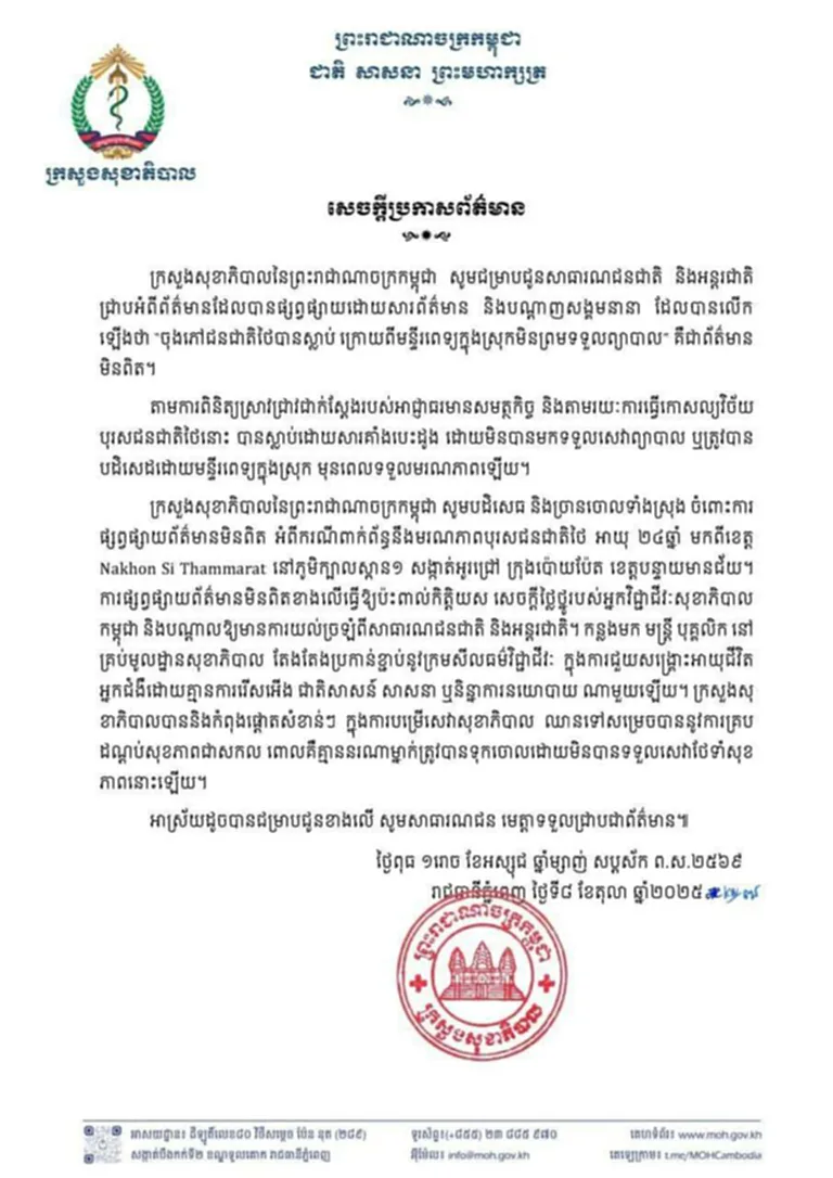 กระทรวงสาธารณสุขแห่งกัมพูชา ขอปฏิเสธการเผยแพร่ข้อมูลอันเป็นเท็จ เกี่ยวกับกรณีการเสียชีวิตของชายไทยอายุ 24 ปี จากจังหวัดนครศรีธรรมราช ณ หมู่บ้านกบาลสะเปียน 1 ตำบลโอชรอฟ เมืองปอยเปต จังหวัดบันเตียเมียนเจยอย่างสิ้นเชิง การเผยแพร่ข้อมูลอันเป็นเท็จดังกล่าวเป็นการทำลายเกียรติและศักดิ์ศรีของบุคลากรทางการแพทย์ชาวกัมพูชา และก่อให้เกิดความเข้าใจผิดในหมู่ประชาชนทั้งในประเทศและต่างประเทศ