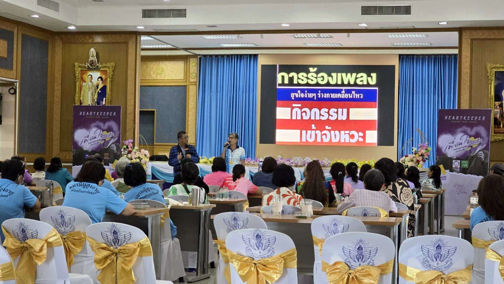 จากนั้นแกนนำผู้สูงอายุกว่า 70 คน จาก 12 ตำบล ได้รับความรู้เรื่อง “สุขภาพ…ใจดี ร่ายกาย(ก็)มีสุข” ความสำคัญของอาสาสมัครสุขภาพใจดี, แนวทางการประเมินและคัดกรองสุขภาพจิตผู้สูงอายุ, ผู้เข้าร่วมอบรมยังได้เรียนรู้ผ่านกิจกรรมฐานปฏิบัติจริง อาทิ ฐาน “Mindful Movement” ท่าเหยียดและฝึกหายใจสำหรับผู้สูงอายุ, ทักษะฟังใจ 3 ขั้น ตั้งใจฟัง ถามใส่ใจ ทวนกลับด้วยหัวใจ รวมถึงการส่งต่อสุขภาพจิตด้วย ที่ให้ความรู้เกี่ยวกับกระบวนการส่งต่อผู้ป่วยสู่การดูแลที่เหมาะสม