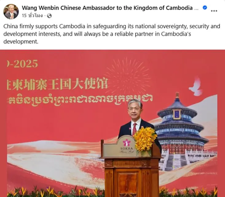 มีประเด็นร้อนในโลกออนไลน์ เมื่อช่วงเย็นวานนี้ หวัง เหวินปิน เอกอัครราชทูตจีนประจำกัมพูชา โพสต์เฟซบุ๊กส่วนตัว เป็นข้อความสั้นๆภาษาอังกฤษ แปลเป็นไทยว่า จีนสนับสนุนกัมพูชาอย่างมั่นคงในการปกป้องอธิปไตย ความมั่นคงและการพัฒนาของชาติ และจะเป็นหุ้นส่วนที่เชื่อถือได้ในการพัฒนาของกัมพูชา