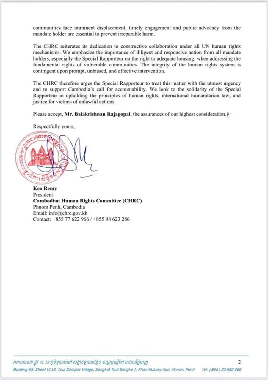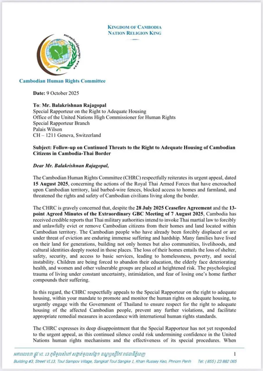 วันที่ 9 ตุลาคม 2568 คณะกรรมการสิทธิมนุษยชนแห่งกัมพูชา หรือ CHRC ทำหนังสือถึงนายบาลากฤษณัน ราชาโกปาล ผู้รายงานพิเศษว่าด้วยสิทธิในการมีที่อยู่อาศัยที่เพียงพอ สำนักงานข้าหลวงใหญ่สิทธิมนุษยชนแห่งสหประชาชาติ หรือ OHCHR