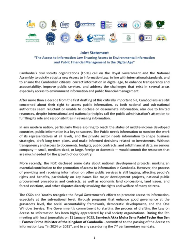 เมื่อวานนี้ (8 ตค.) ตัวแทนองค์กรภาคประชาสังคมของกัมพูชา (CSOs) ออกแถลงการณ์ร่วมเรียกร้องรัฐบาลและรัฐสภากัมพูชาเร่งรับรองกฎหมายฉบับใหม่ว่าด้วย “การเข้าถึงข้อมูลข่าวสาร” ให้สอดคล้องกับมาตรฐานสากล เพื่อรับรองสิทธิของประชาชนกัมพูชาในการเข้าถึงข้อมูลที่ถูกต้องในยุคดิจิทัล เสริมสร้างความโปร่งใสและความรับผิดชอบ ปรับปรุงการให้บริการสาธารณะ และแก้ไขปัญหาที่มีอยู่ในหลายด้าน โดยเฉพาะการเข้าถึงข้อมูลด้านสิ่งแวดล้อมและการบริหารการเงินภาครัฐ